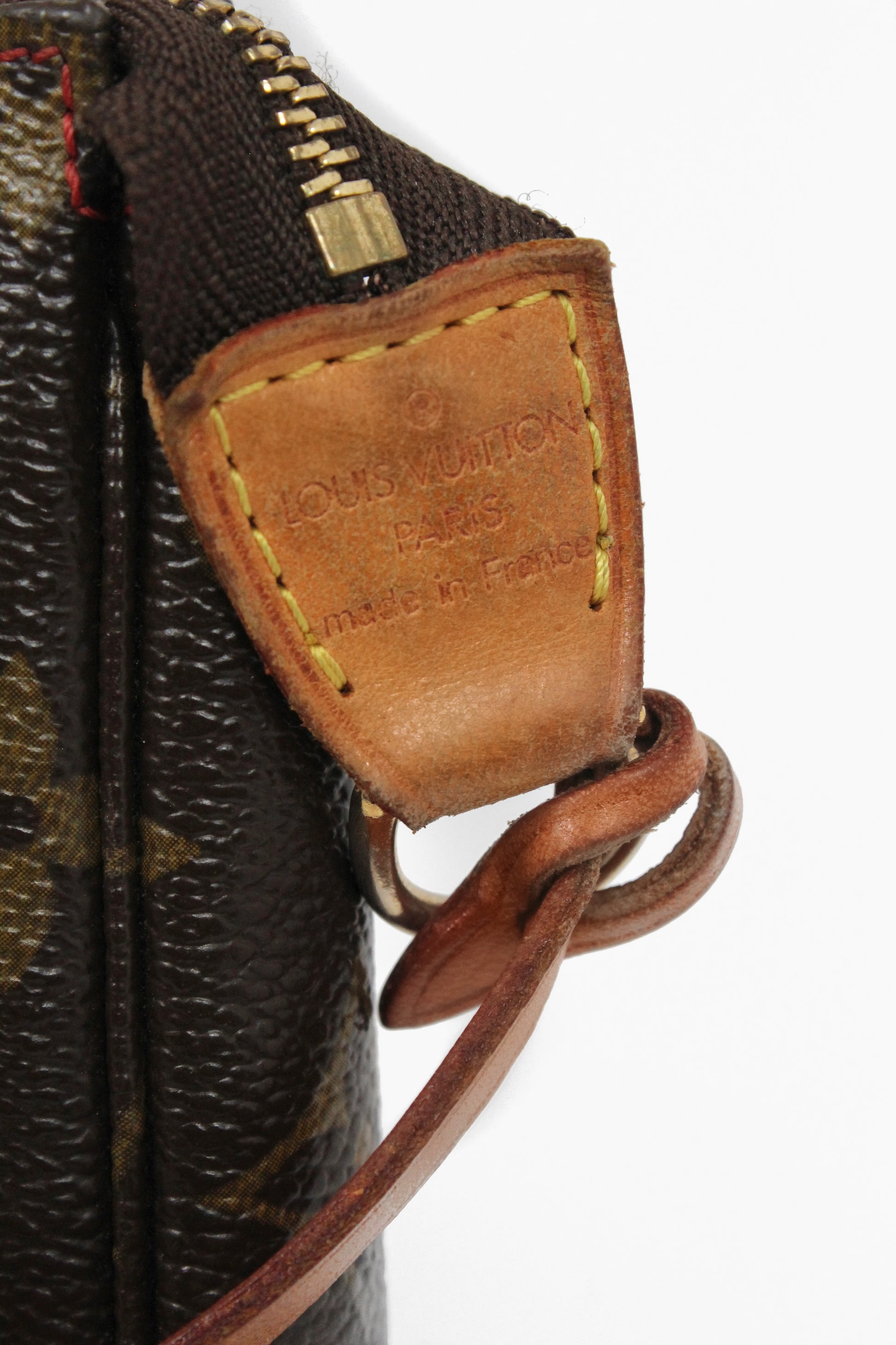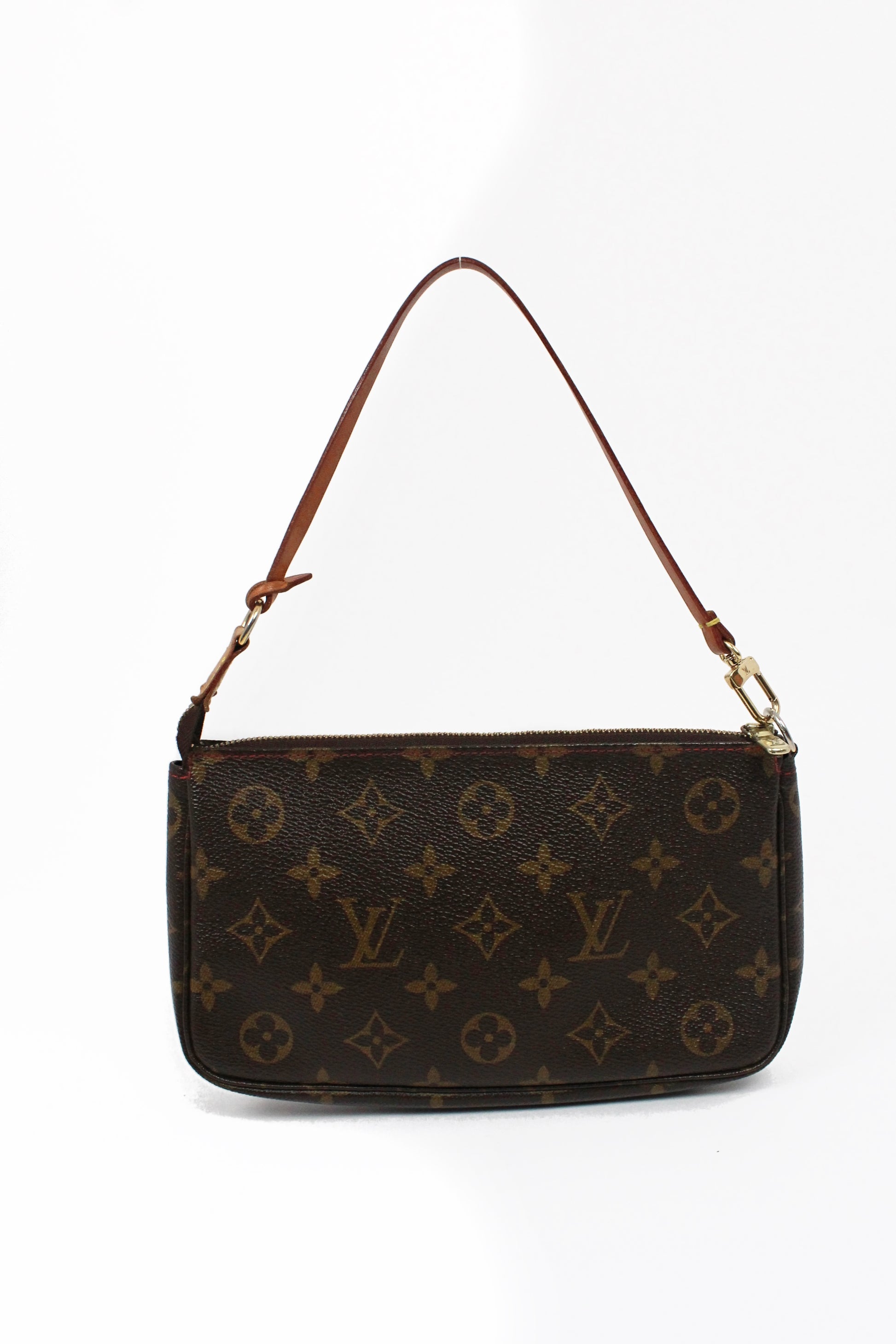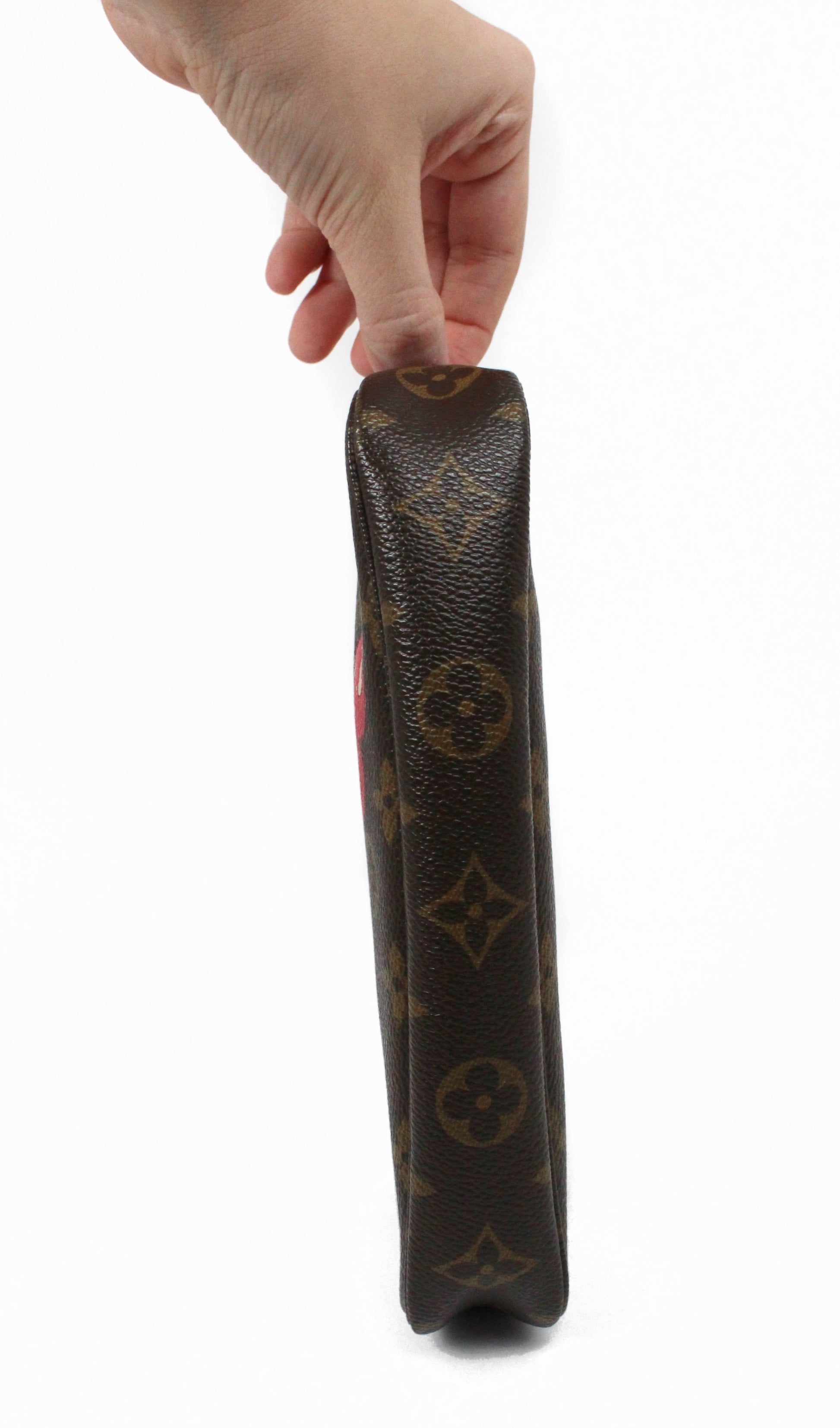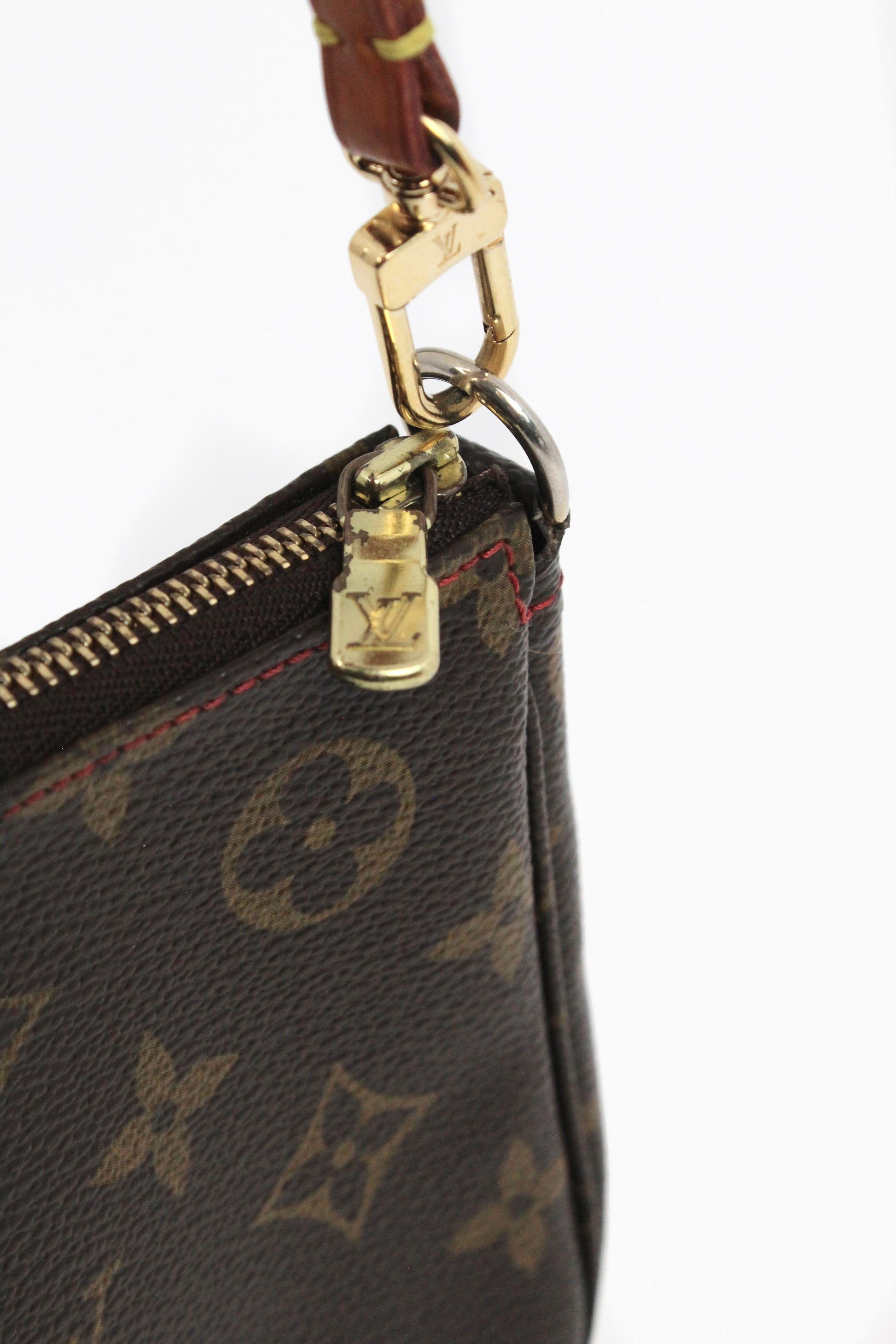 - The limited edition Louis Vuitton x Takashi Murakami Monogram Cherry Pochette with gold hardware is the perfect bag for everyday use. Original strap included with warm honey vachetta. The pochette features the iconic monogram canvas body, top zip closure, and textile lining. What sets this pochette apart are the two vibrant cherrys featured on the front of the bag! Spacious interior is in excellent shape. You can fit your phone, small wallet, keys, and a few other smaller essentials.