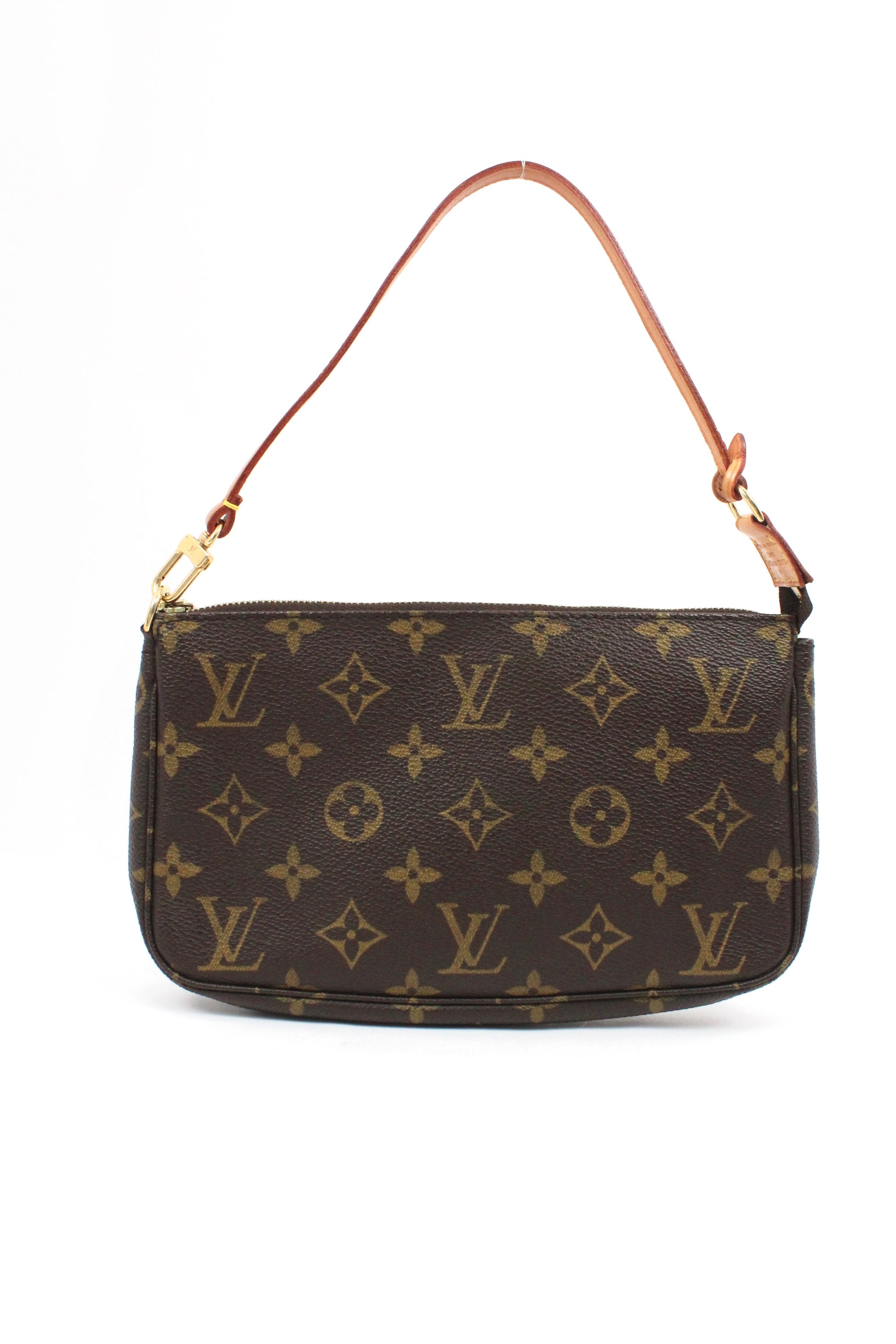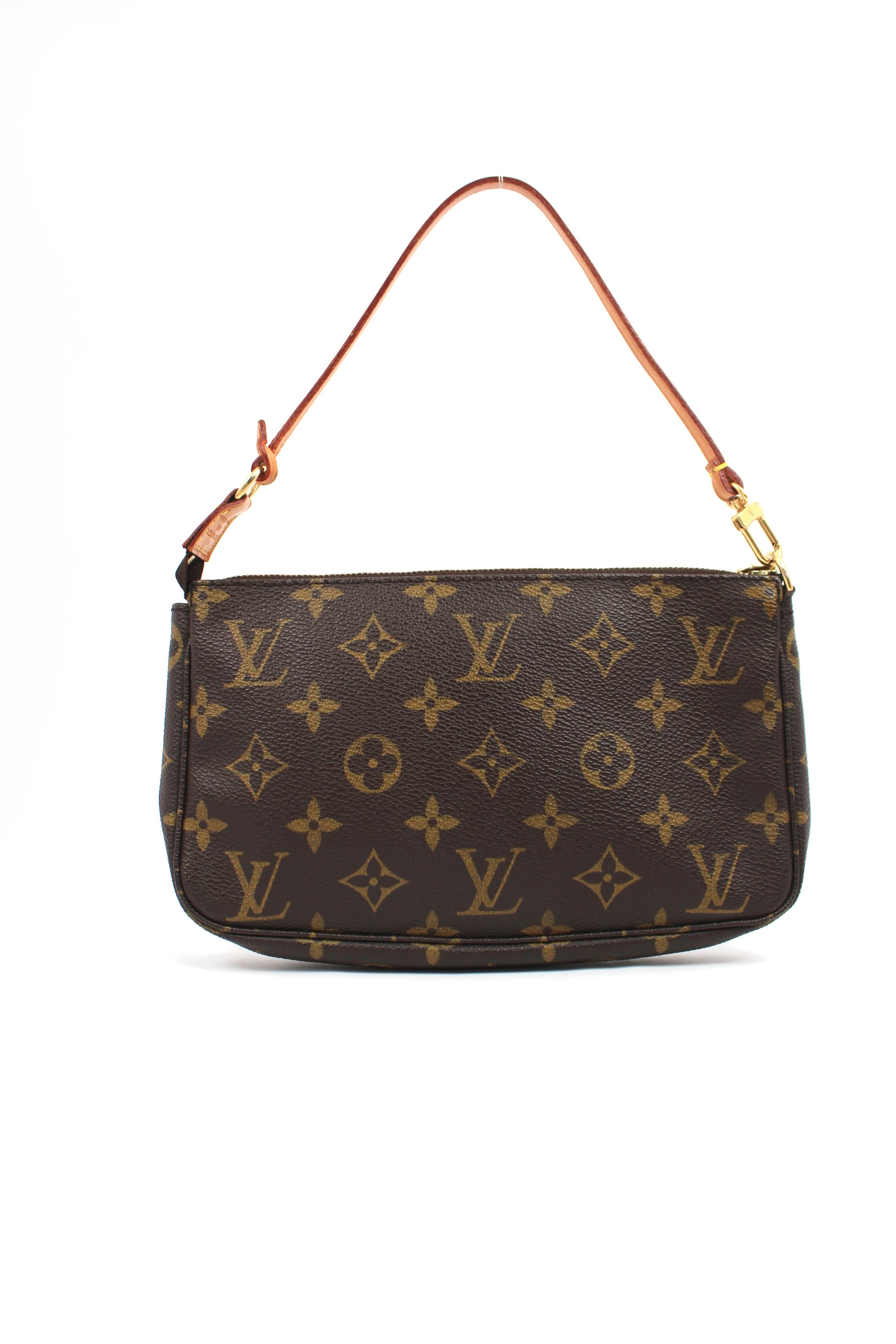 - The perfect starter bag for anyones designer collection - the Louis Vuitton pochette. This bag not only has stood the test of time, but it matches with literally everything. Vibrant Louis Vuitton monogram canvas with textile lining interior. Gold hardware. Original light honey vachetta shoulder strap is in amazing condition! Interior and exterior is clean. Fits all the essentials including phone, wallet, keys, and more.