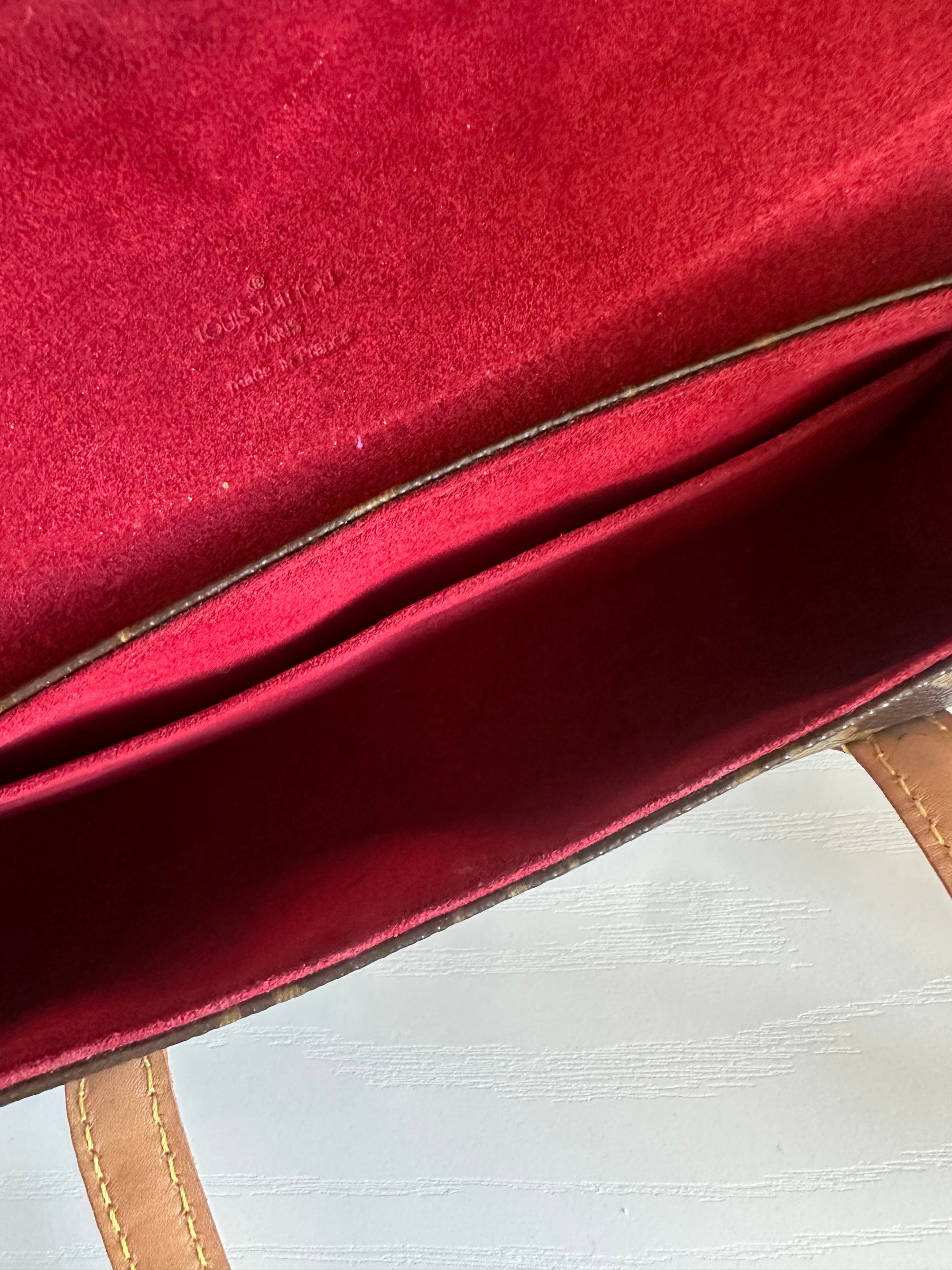 - This Louis Vuitton bag features the iconic monogram canvas with light honey vachetta leather and the iconic red suede interior.