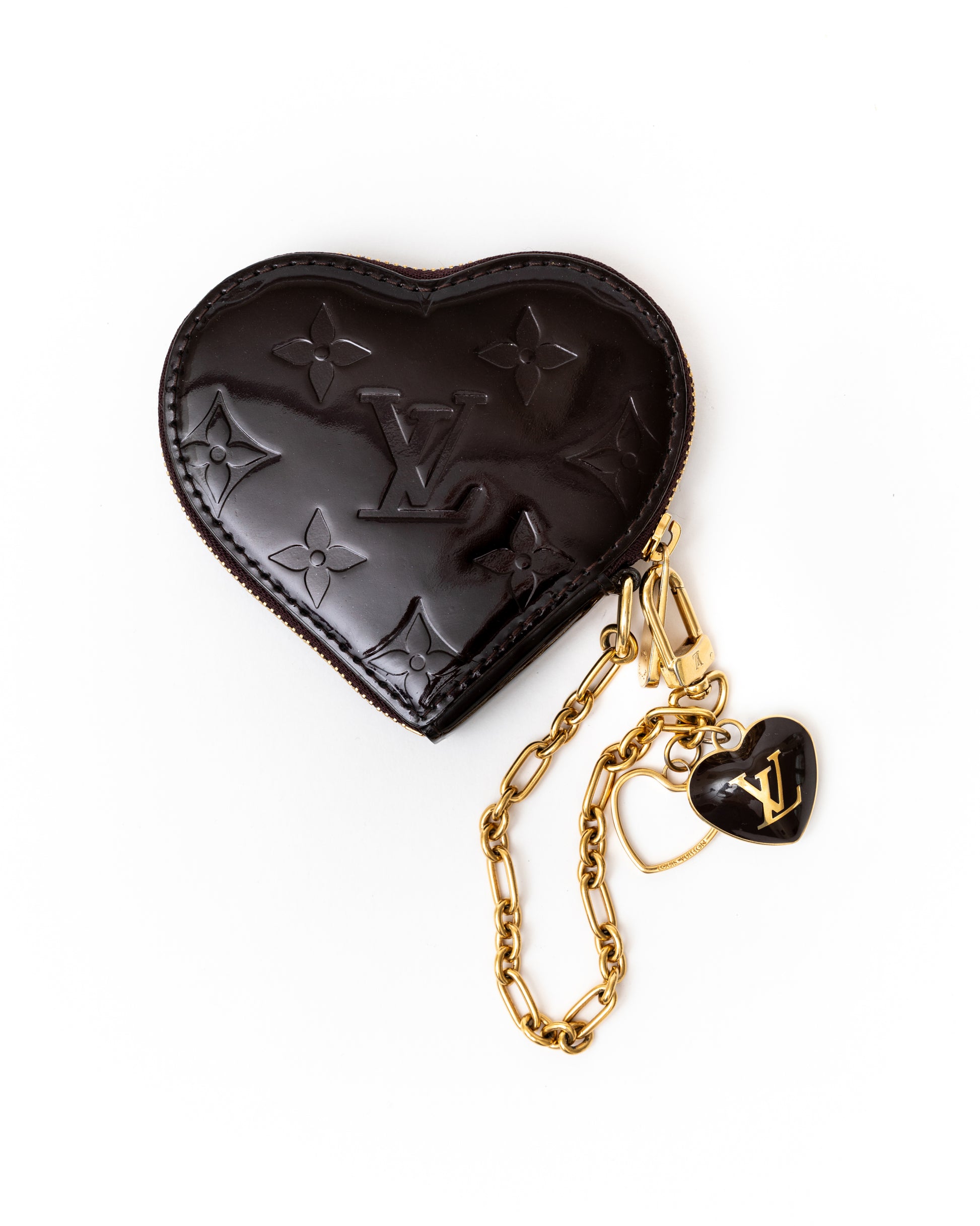 - Circa 2008, this Classic burgundy LV Monogramed coin purse will steal your heart! Durable wrap around brass zipper closure that opens to a matte leather purple compartment for your valuables. Attached is a brass chain with a clasp that you can add on to any of your LV bags!