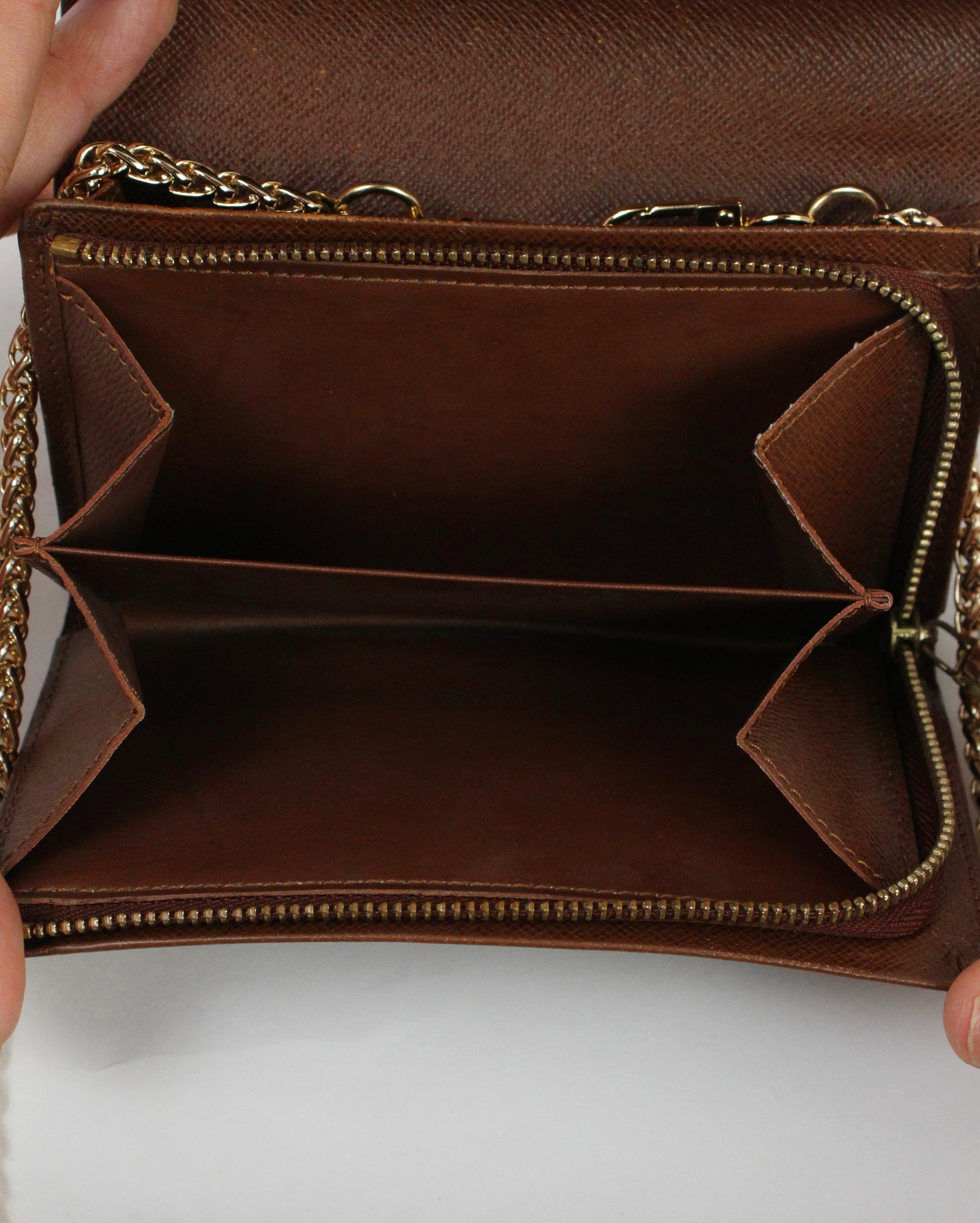 - Gold hardware with added non-branded chain to wear as a long or short-shoulder bag.