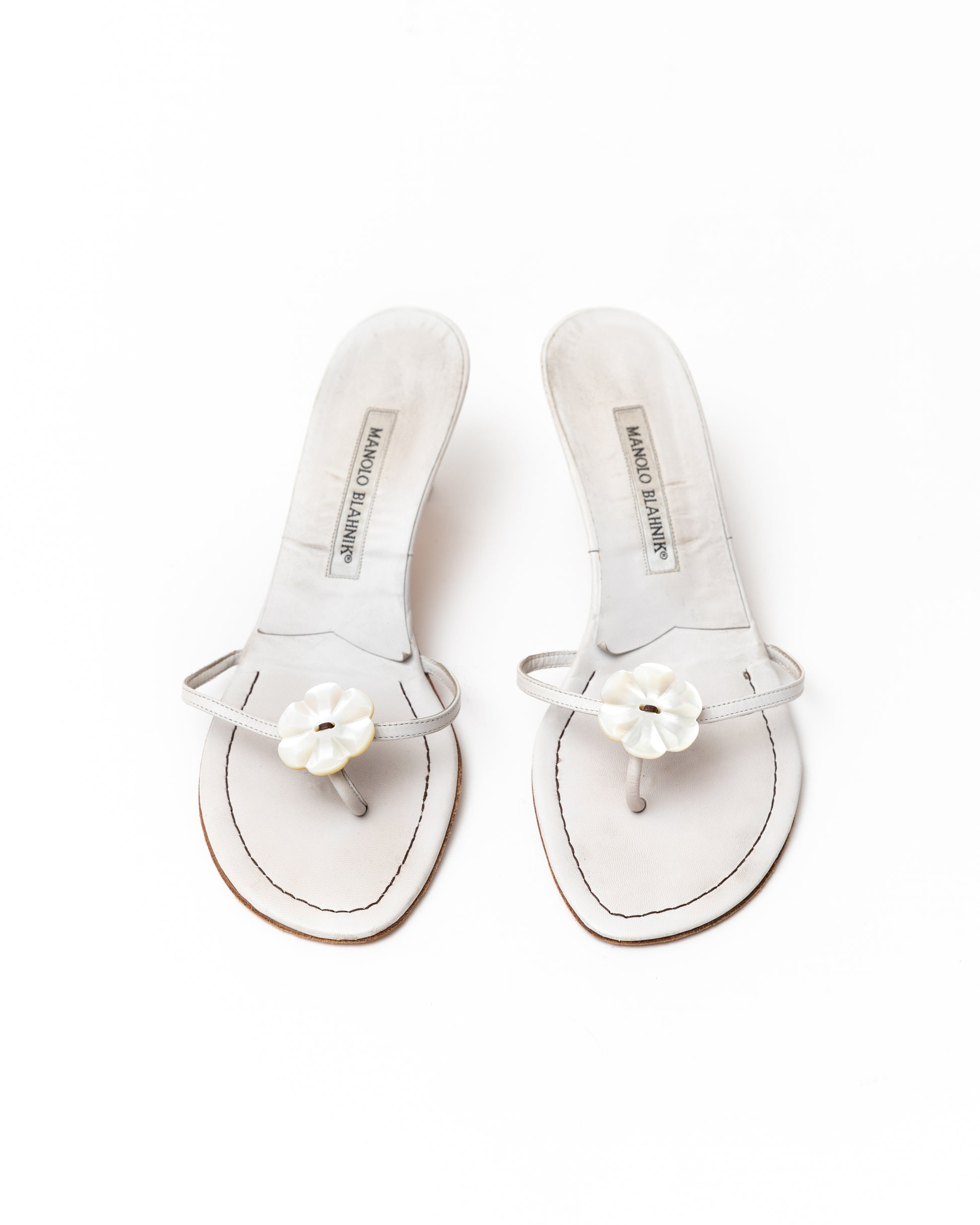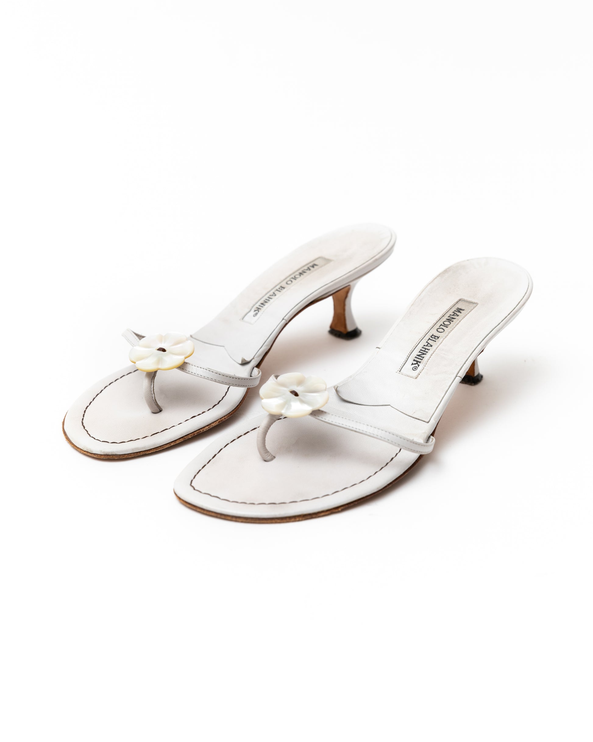 - These rare white leather Manolos feature a small 1.5" kitten heel and an adorable flower accent made from real mother of pearl!