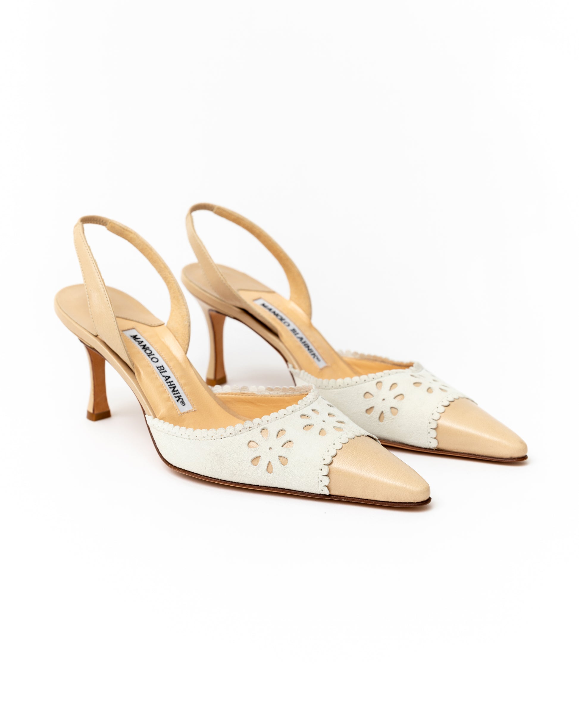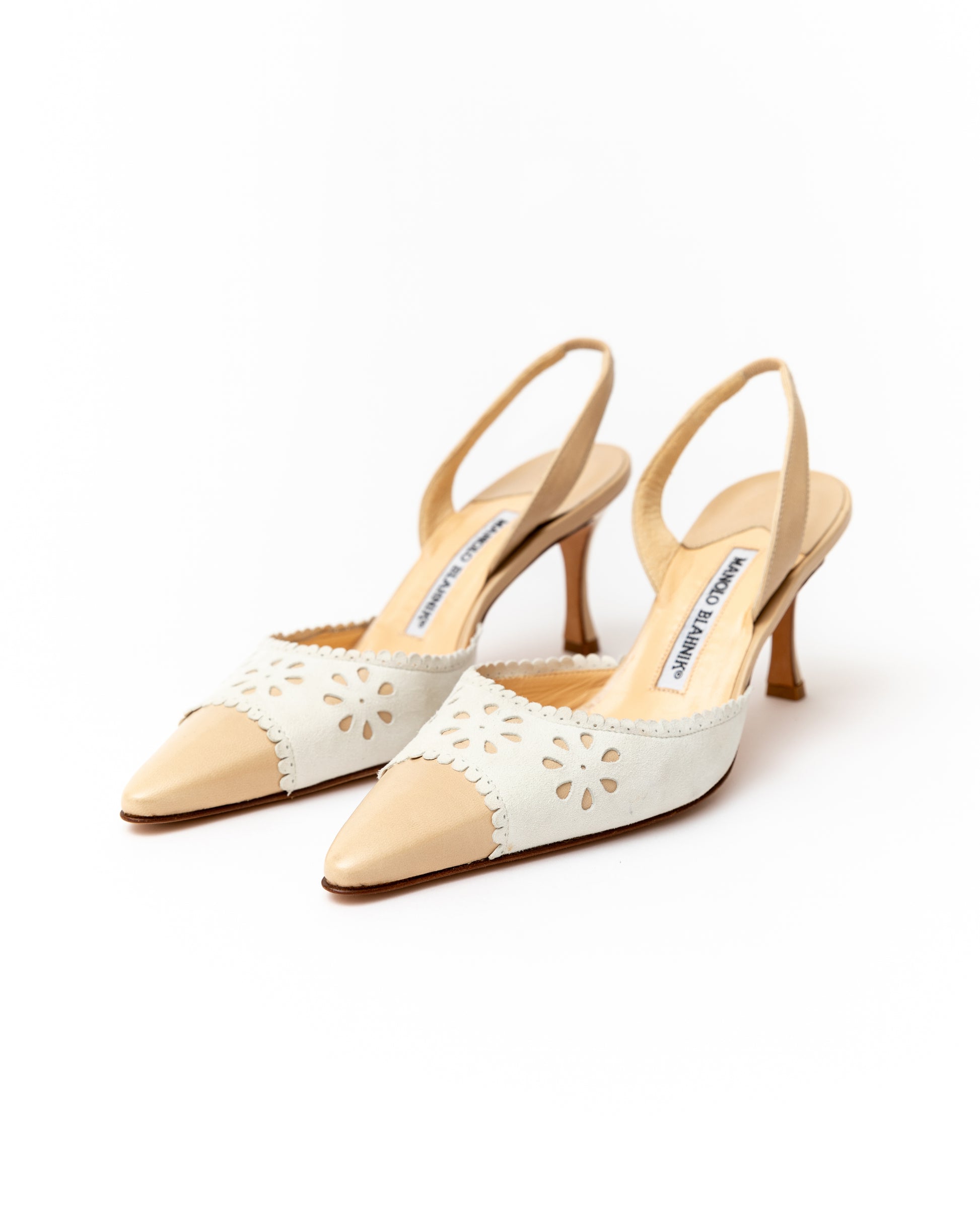 - These Carrie Bradshaw approved Manolos features buttery soft tan leather and cream suede with floral cutout details making it the perfect heel for all your spring/summer adventures.