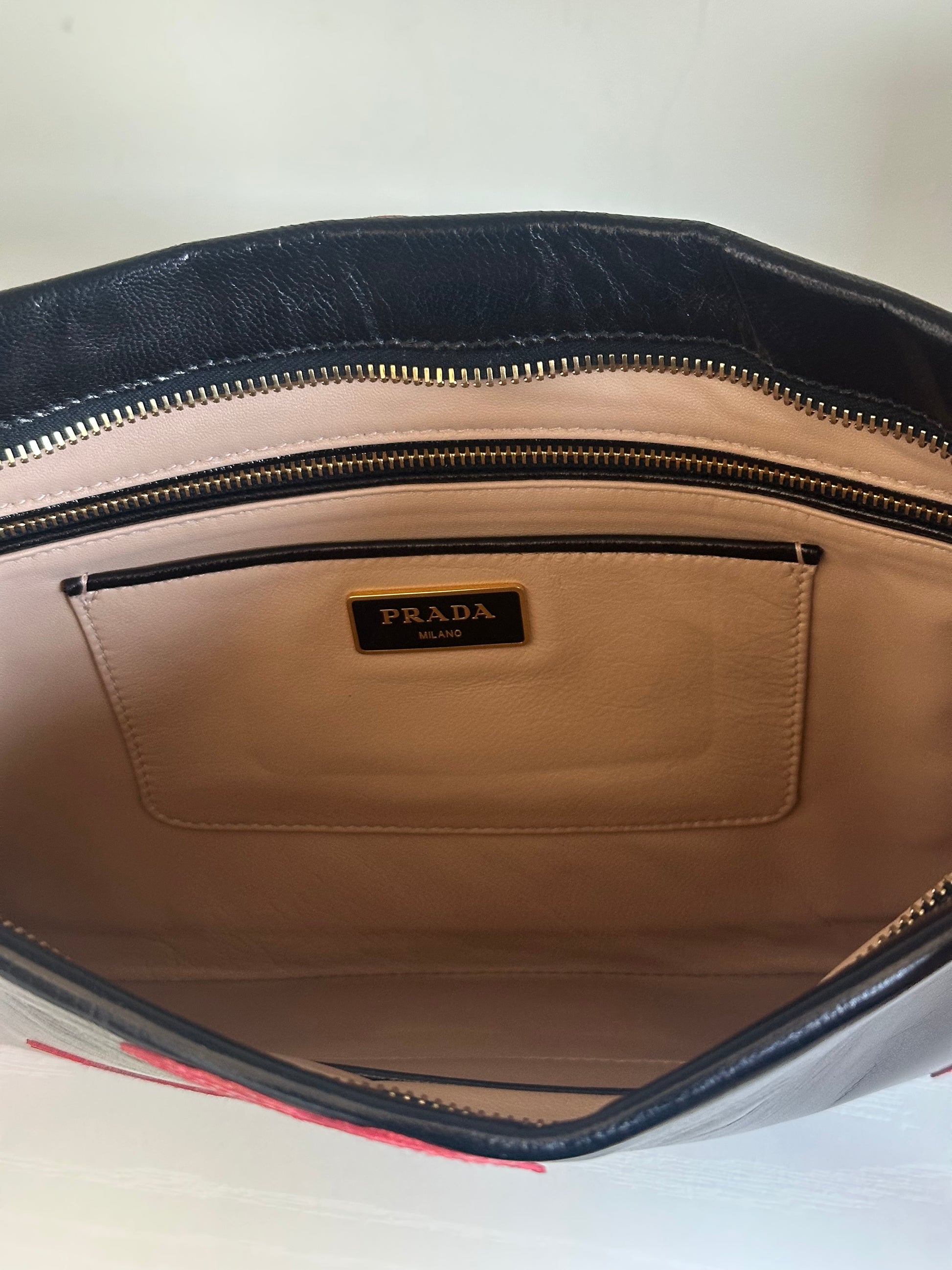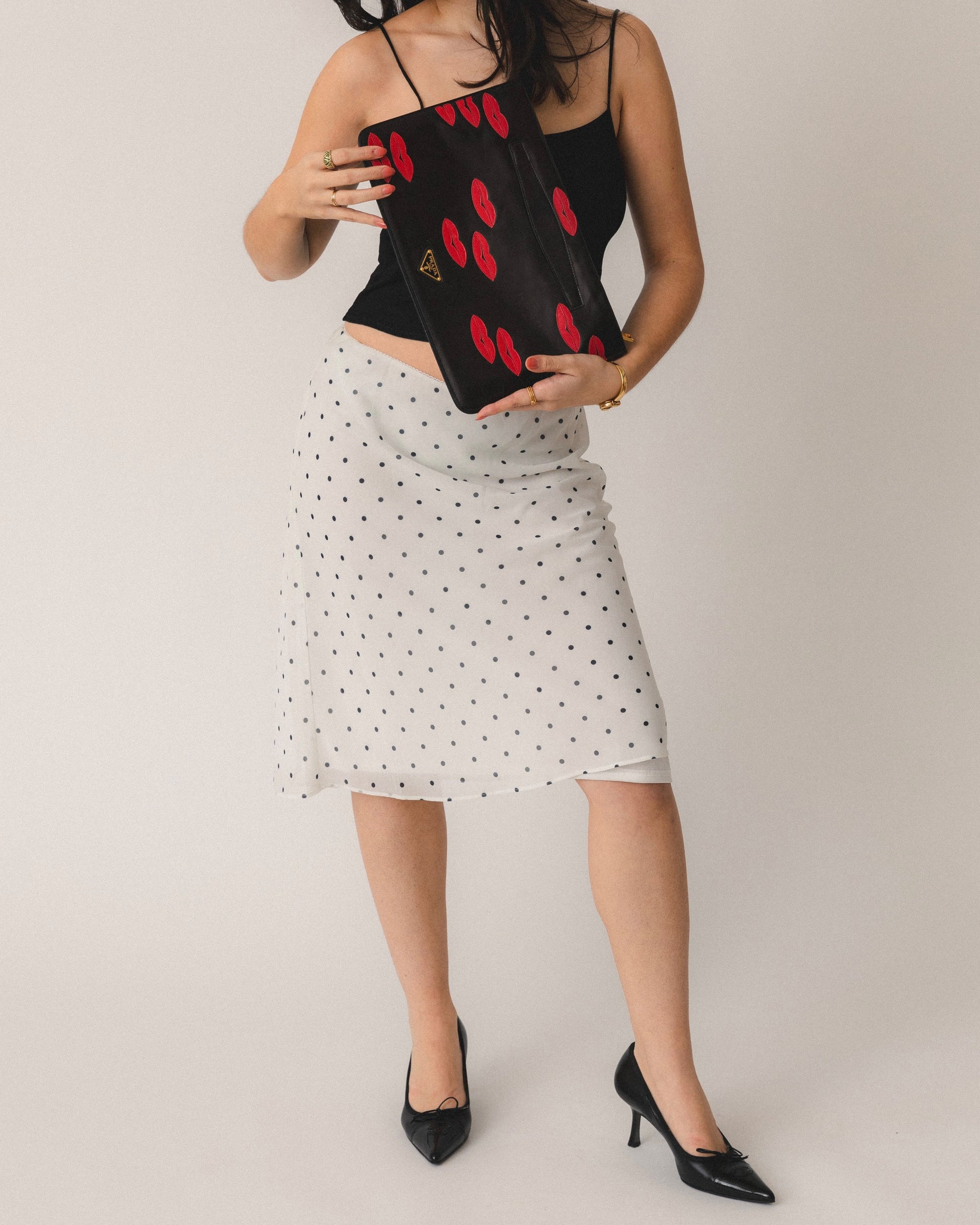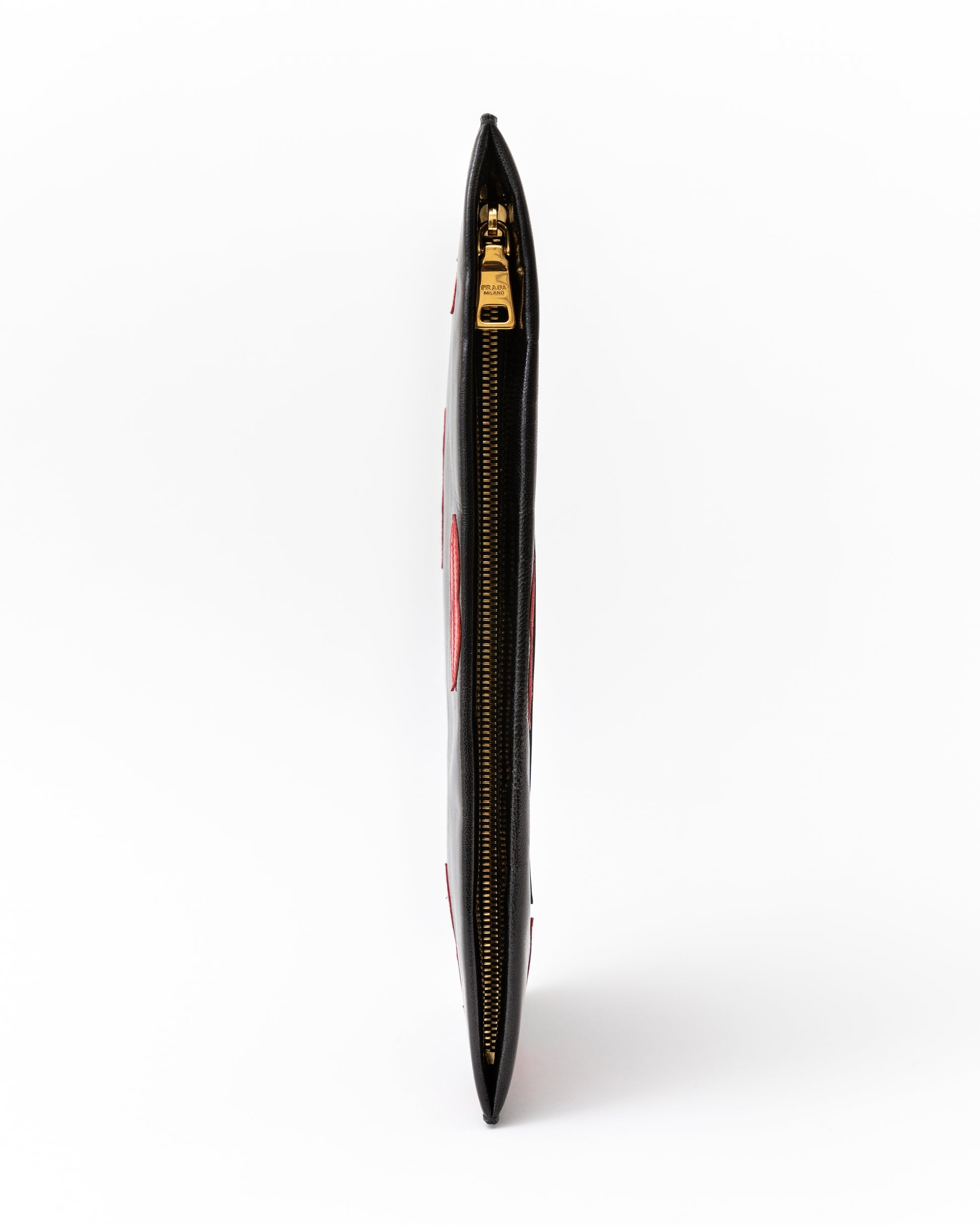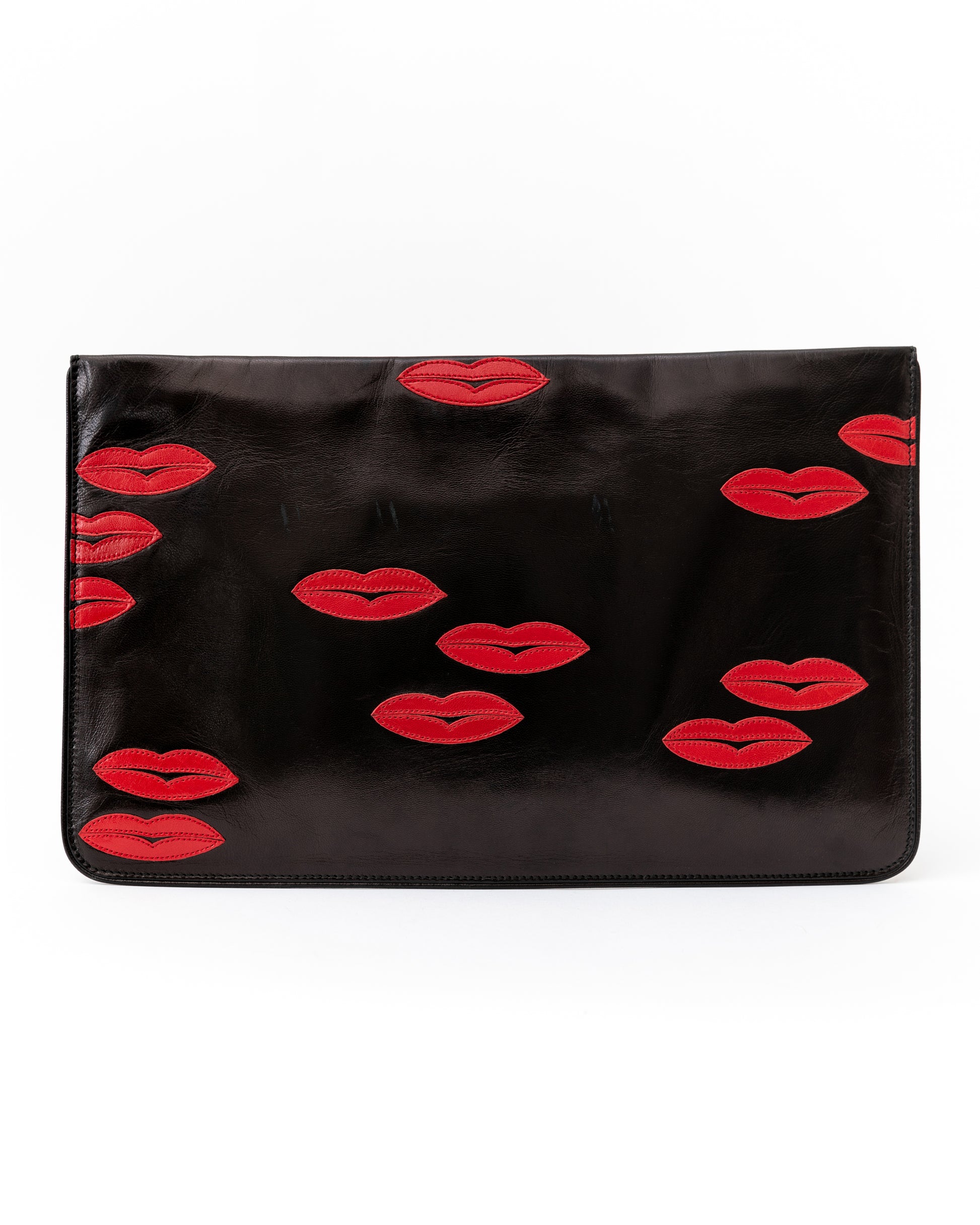 - If Sabrina Carpenter were to turn into a bag - it would be this Prada kiss clutch from the 2002 S/S collection. Features black leather and red kiss accents with gold hardware.