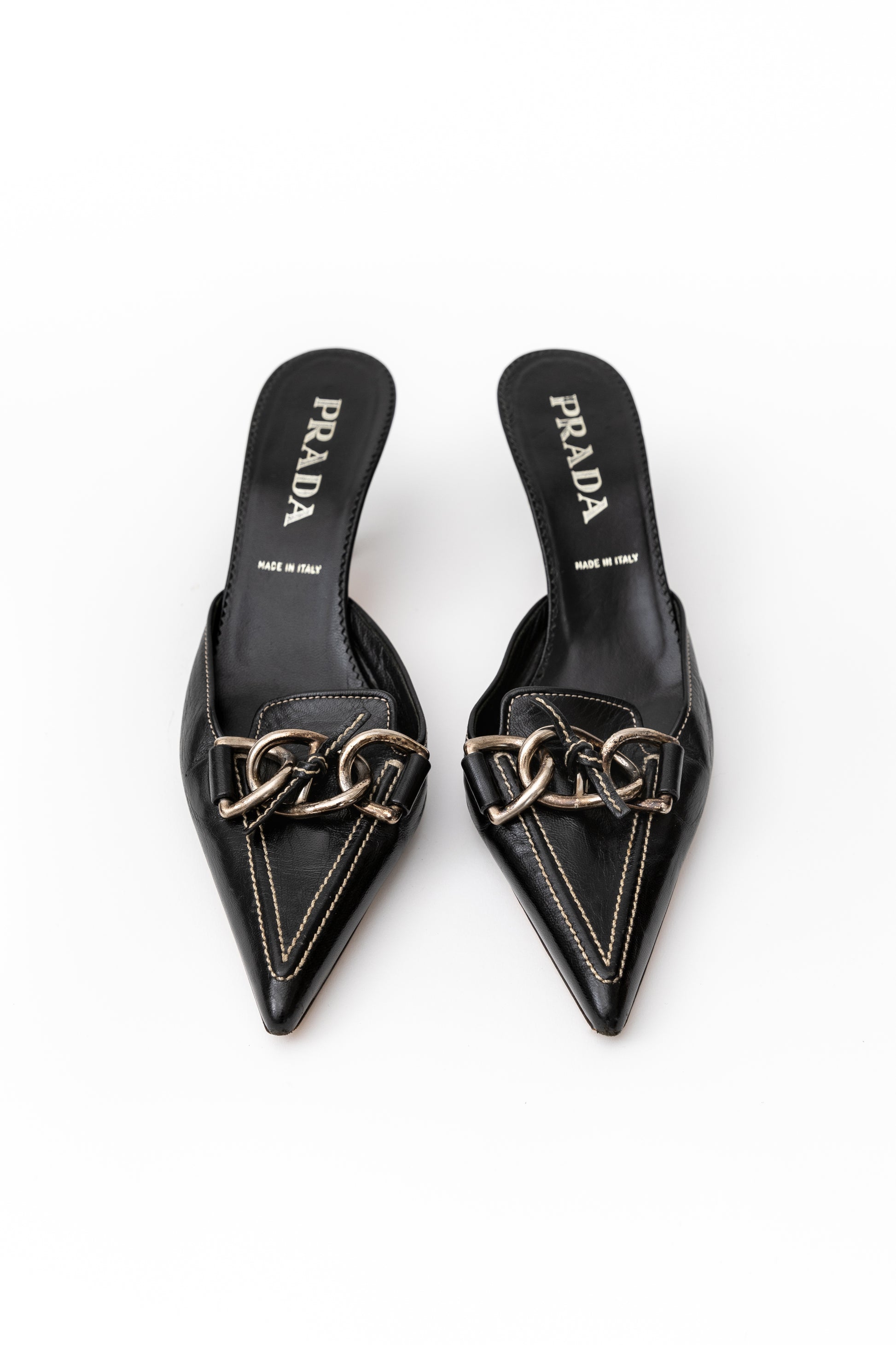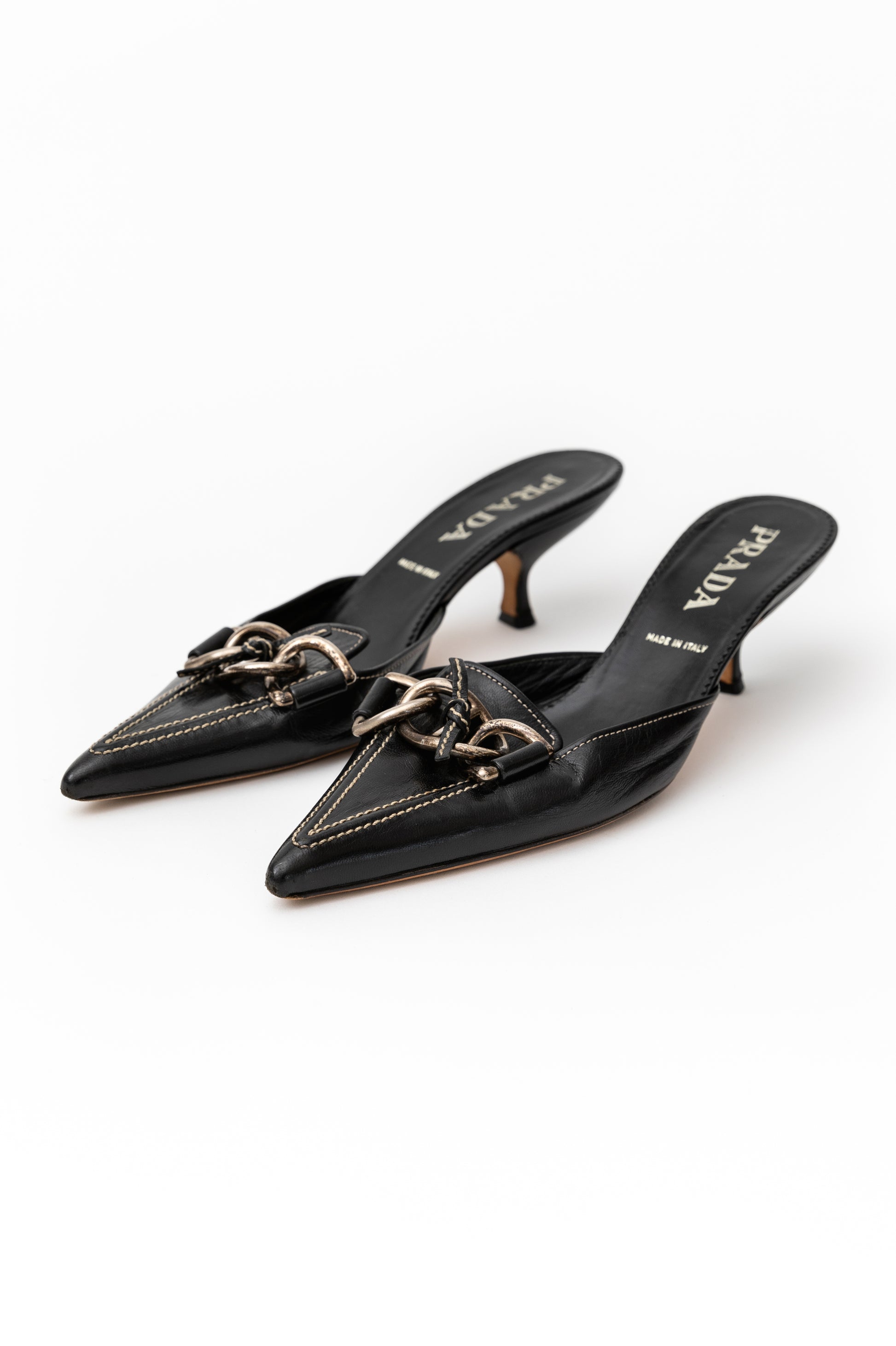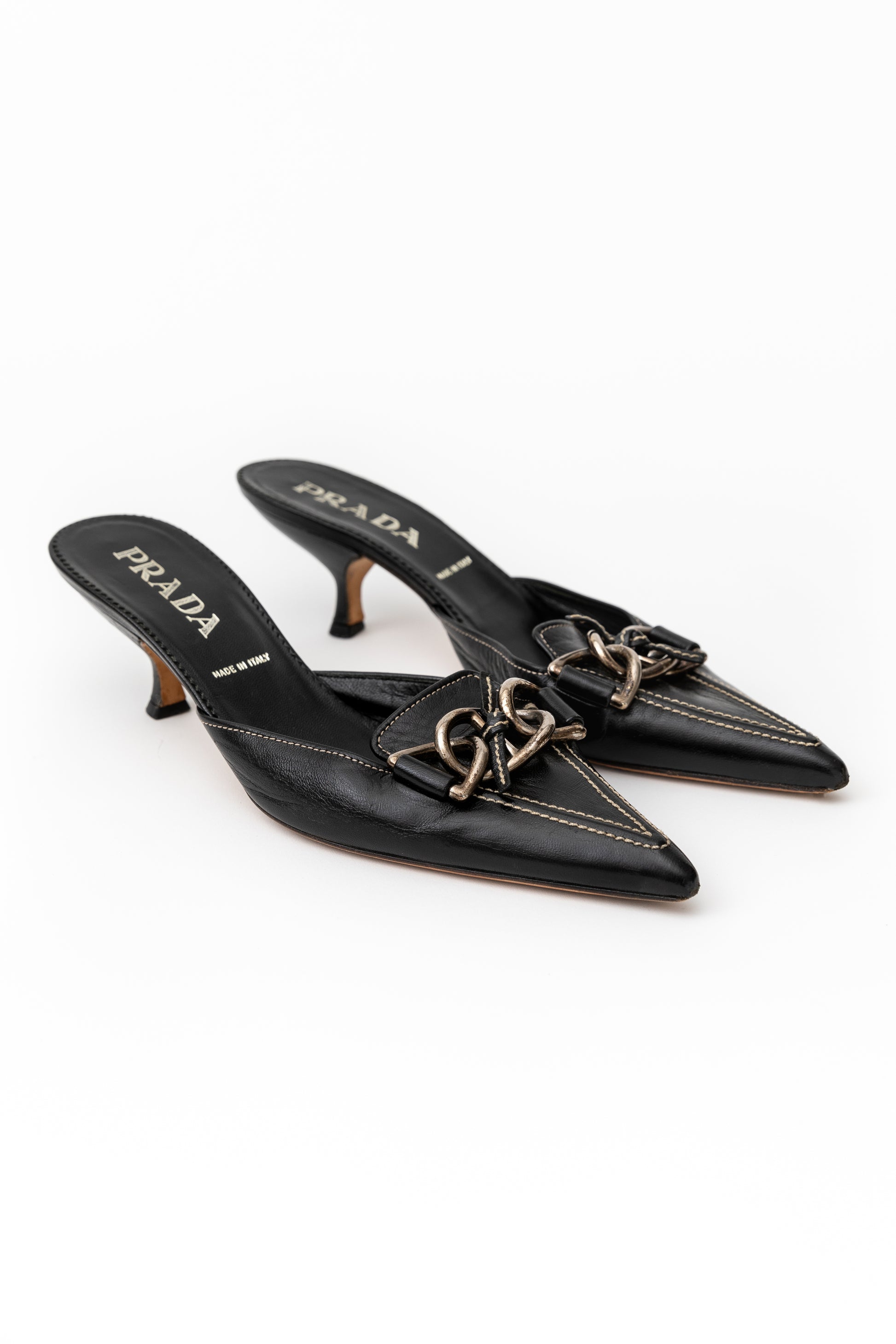 - These stunning Pradas feature black lambskin leather with white contrast stitching and silver hardware. Small 2” kitten heel.