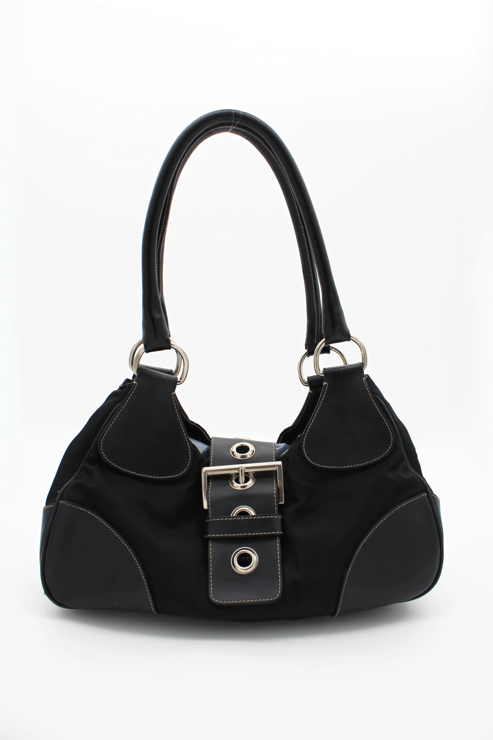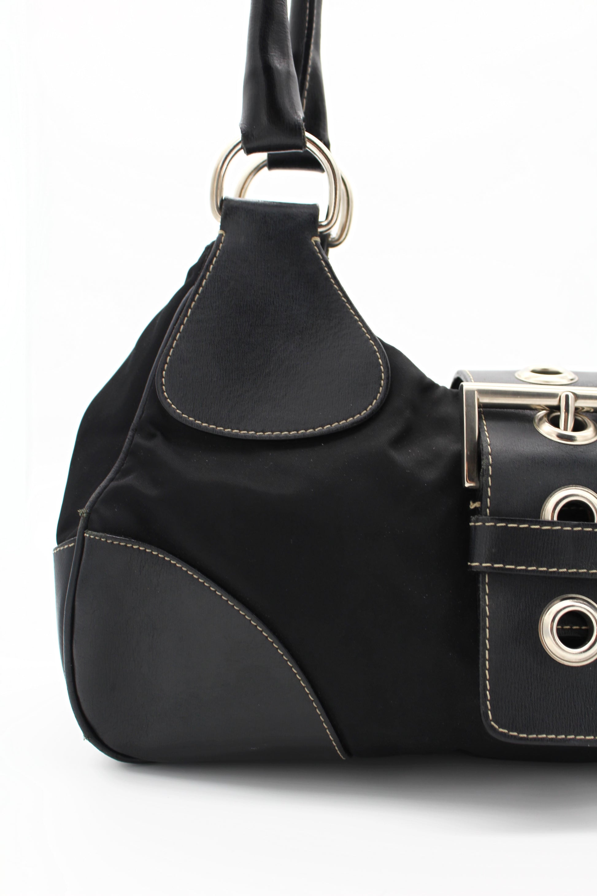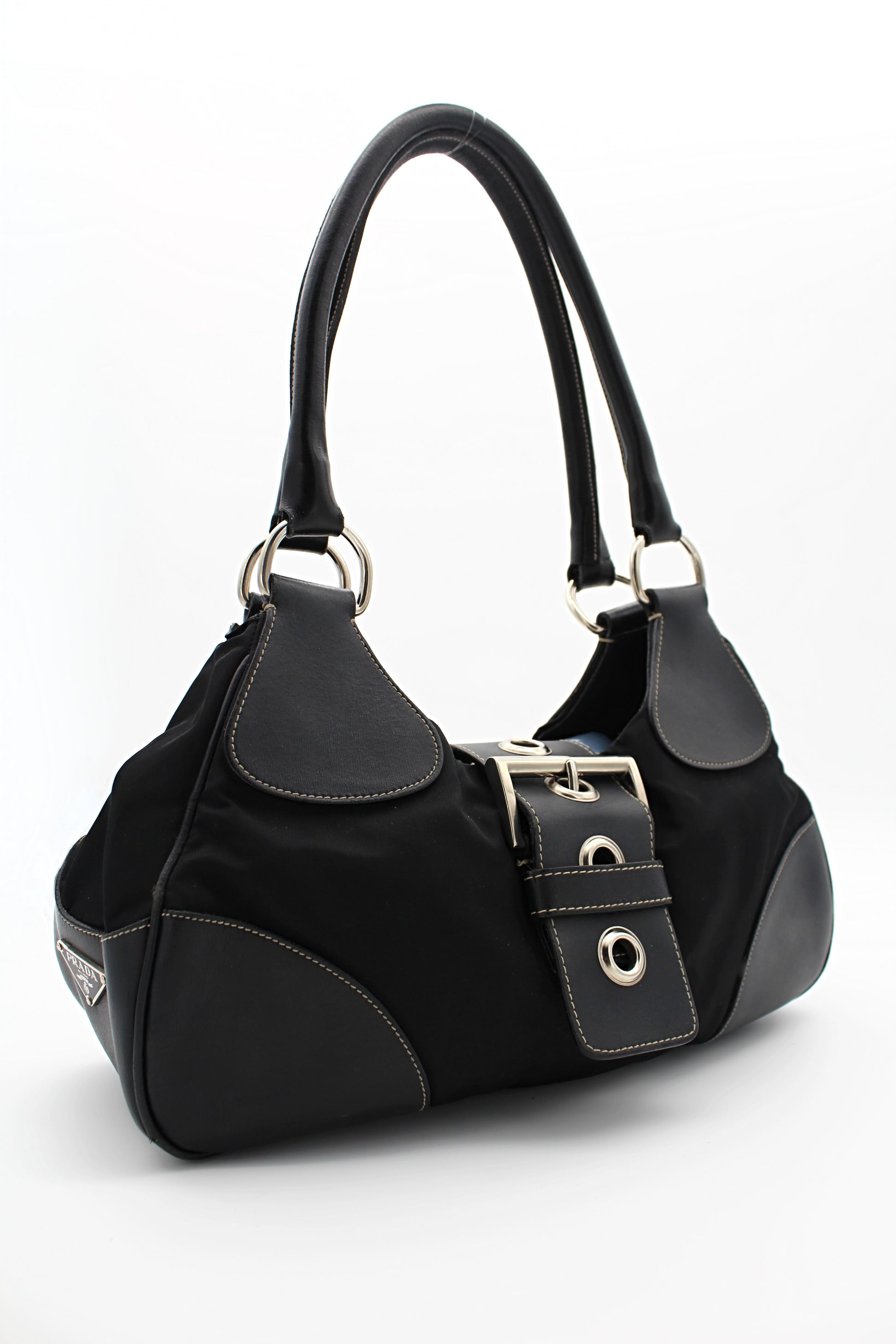 - This stunning 2000s minimalistic Prada bag with black nylon and leather has recently been remade by Prada for $2,500! Get the vintage version for a fraction of the cost. Features the Prada logo plaque on the front side of bag and iconic silver buckle.