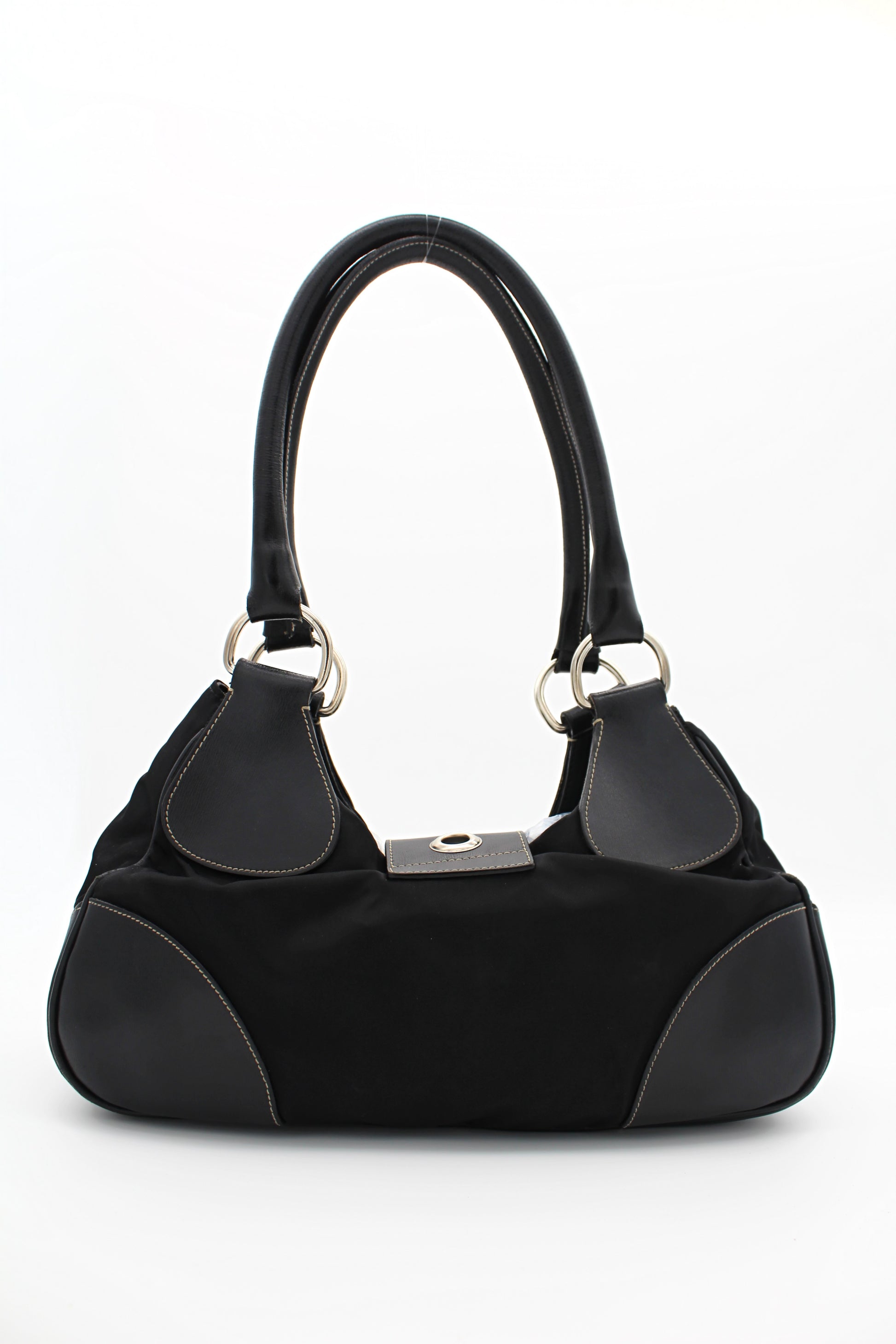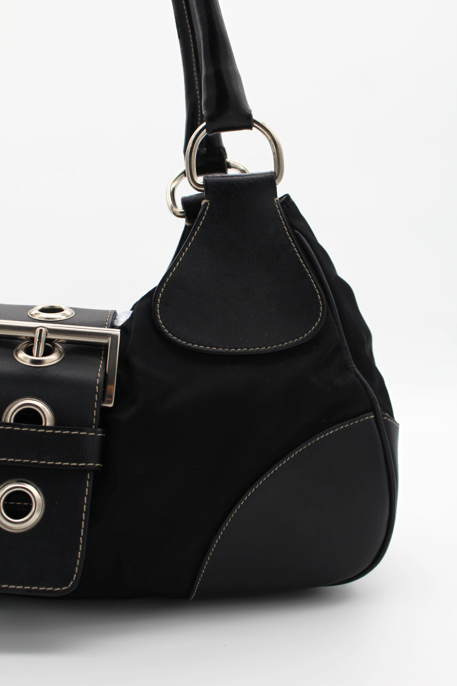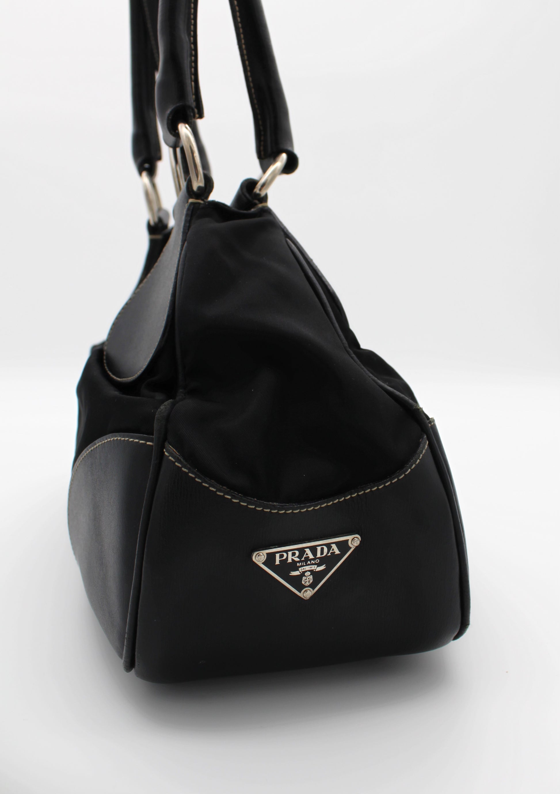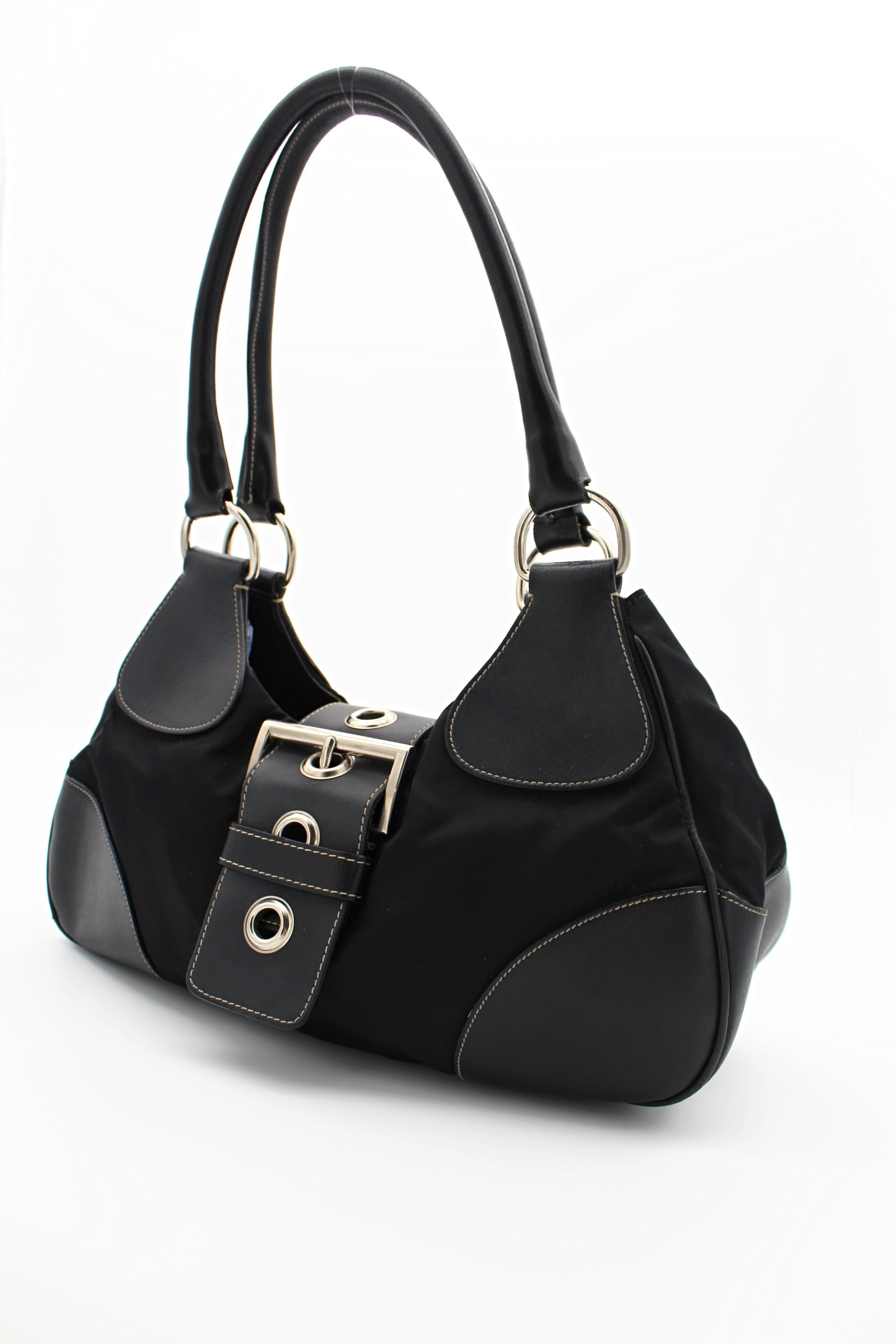 - This stunning 2000s minimalistic Prada bag with black nylon and leather has recently been remade by Prada for $2,500! Get the vintage version for a fraction of the cost. Features the Prada logo plaque on the front side of bag and iconic silver buckle.