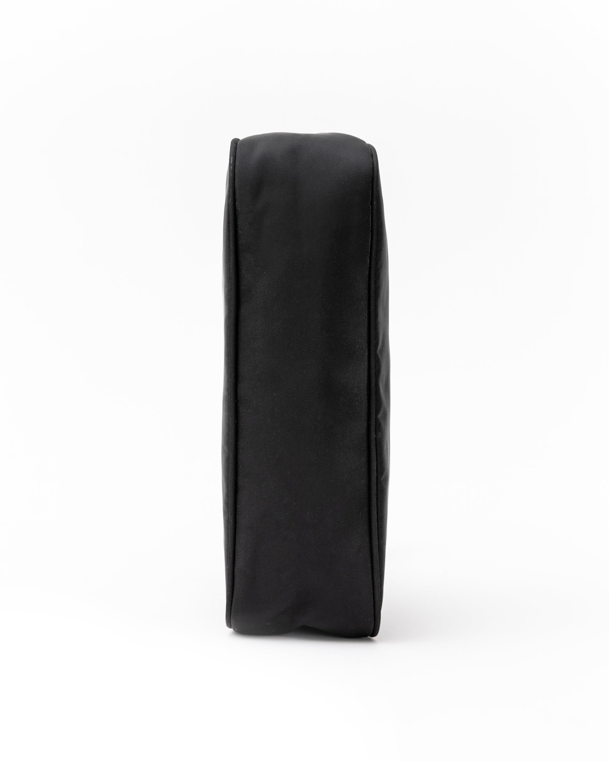 - Black durable and waterproof nylon with silver Prada plaque on center of bag. Spacious interior is spotless.