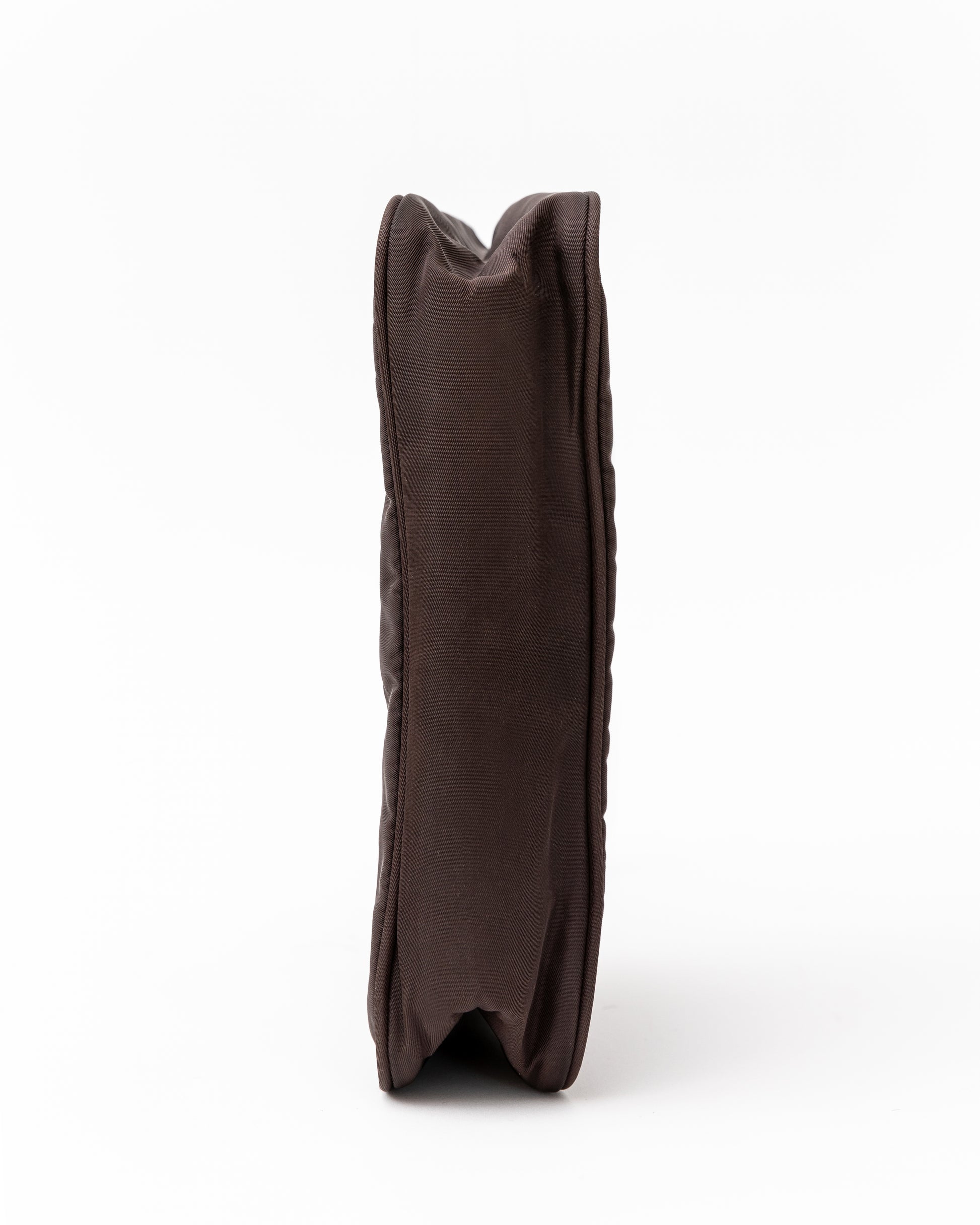 - Burgundy-ish brown durable and waterproof nylon with silver Prada plaque on center of bag. Spacious interior is spotless.