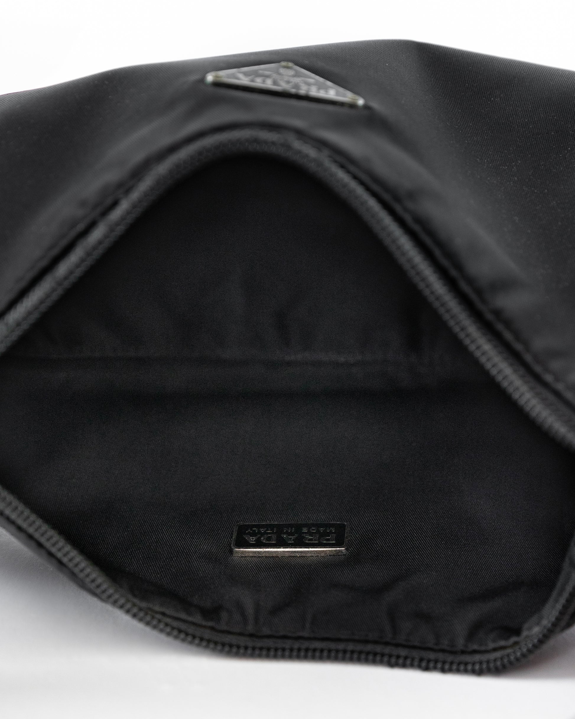 - Black durable and waterproof nylon with silver Prada plaque on center of bag. Spacious interior is spotless.