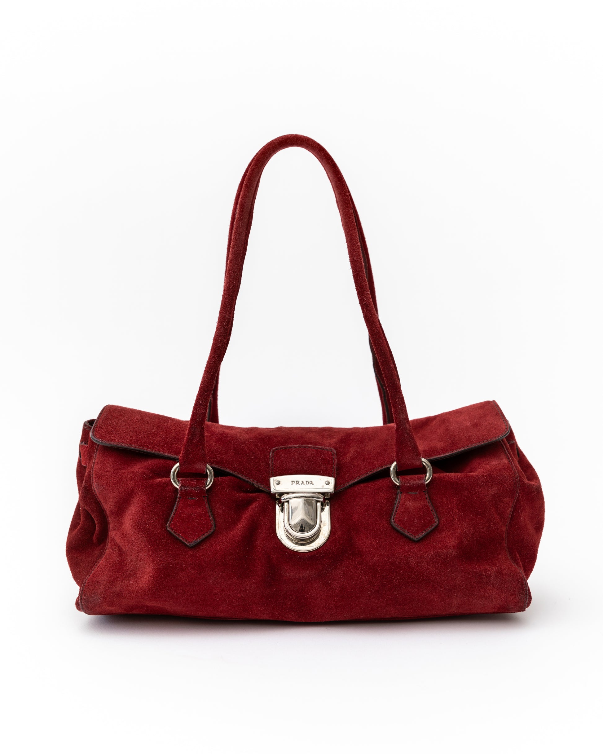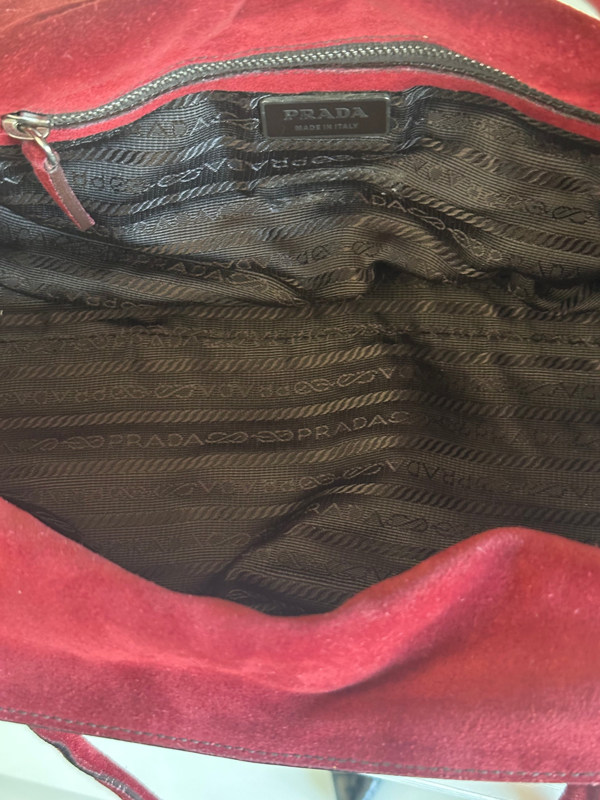 - The original Prada version features red suede with silver hardware and the iconic Prada logo on the side.