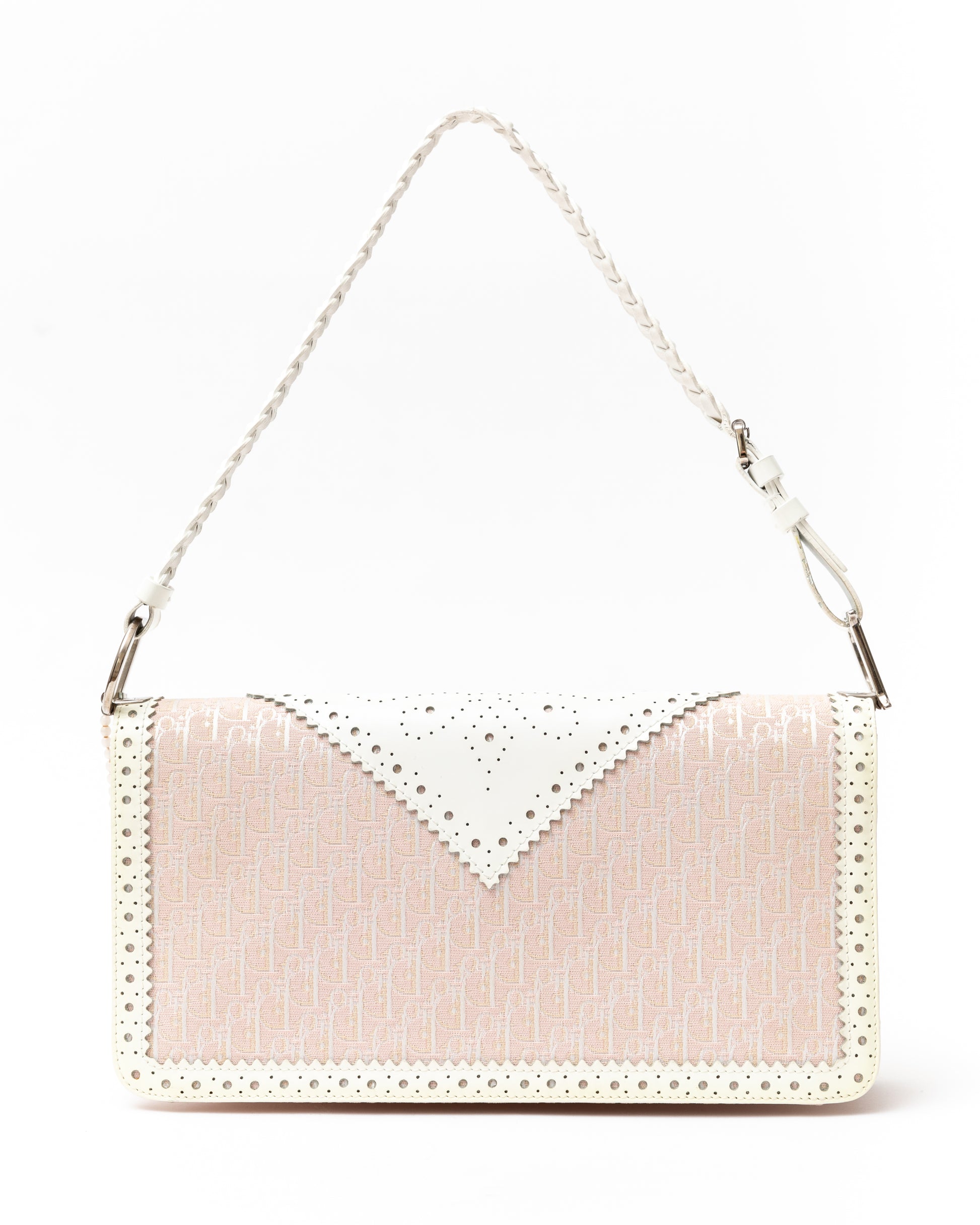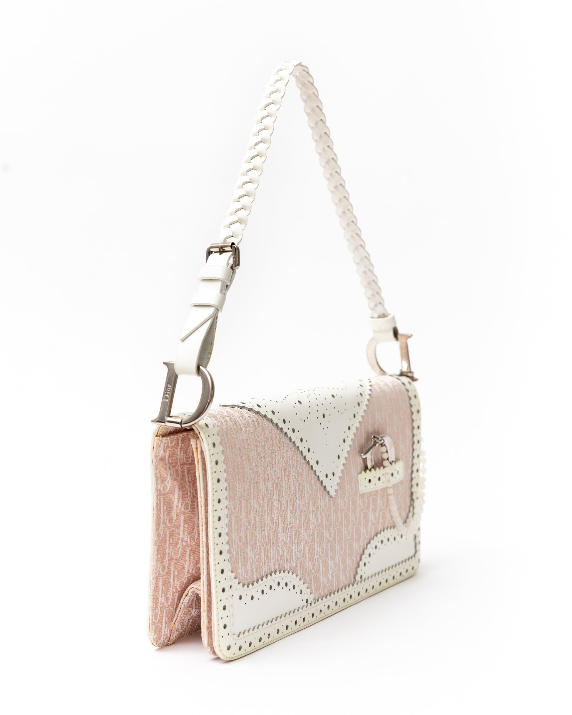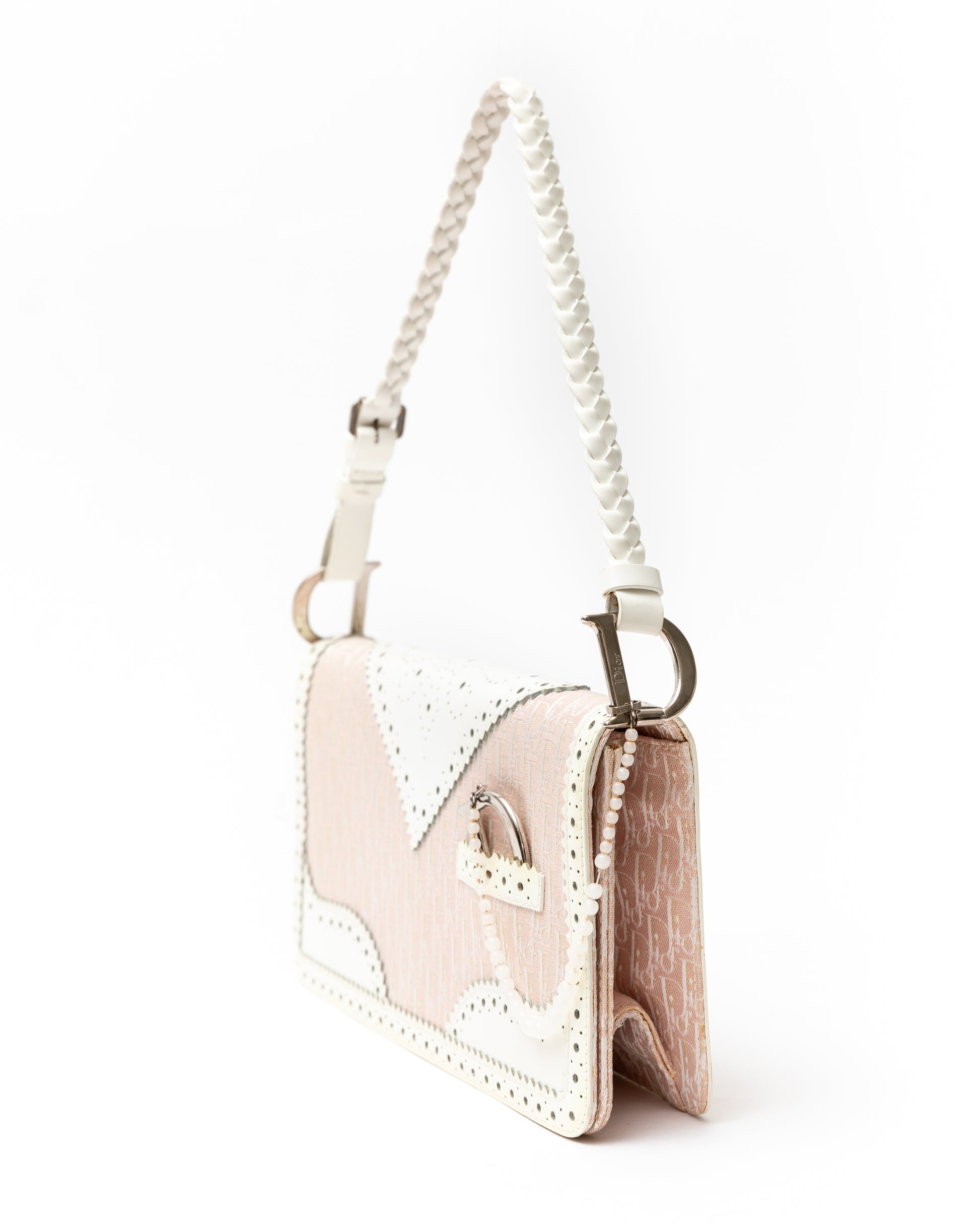 - This very rare cutie from the John Galliano for Dior era bag features a pink Dior monogram, cream leather accents, a pearl D charm attachment, and silver hardware.