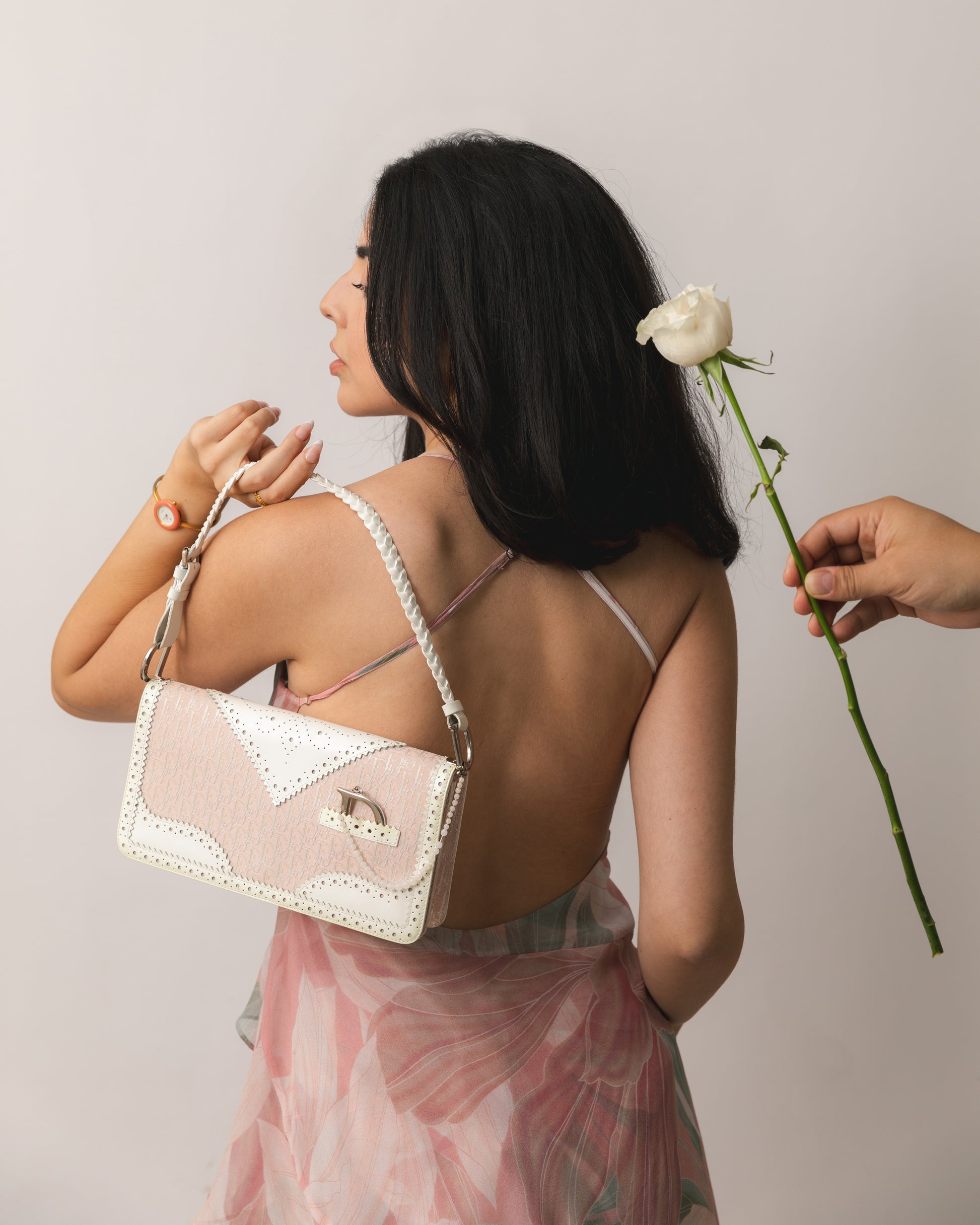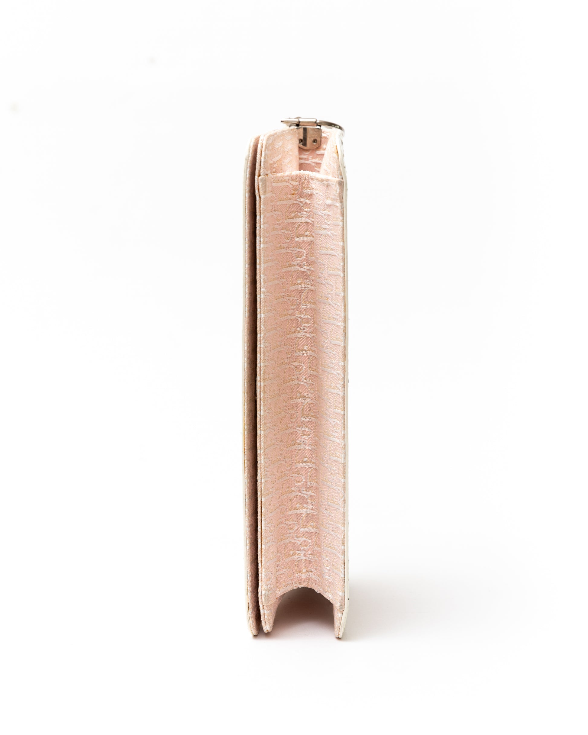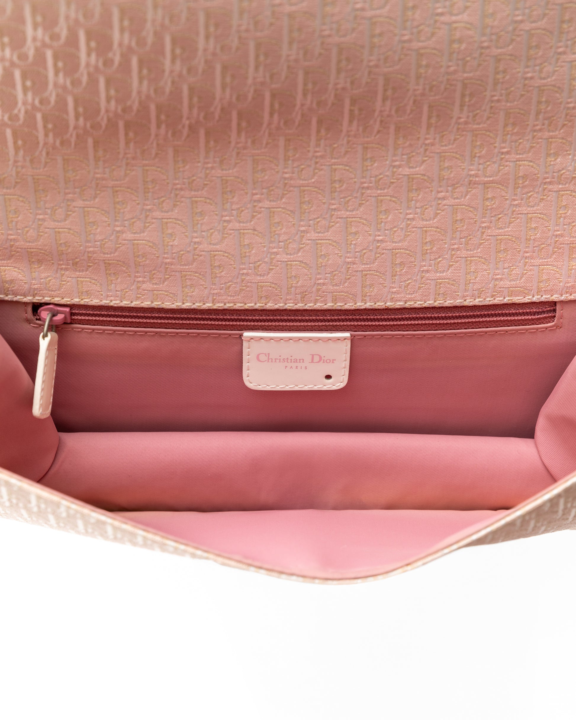 - This very rare cutie from the John Galliano for Dior era bag features a pink Dior monogram, cream leather accents, a pearl D charm attachment, and silver hardware.