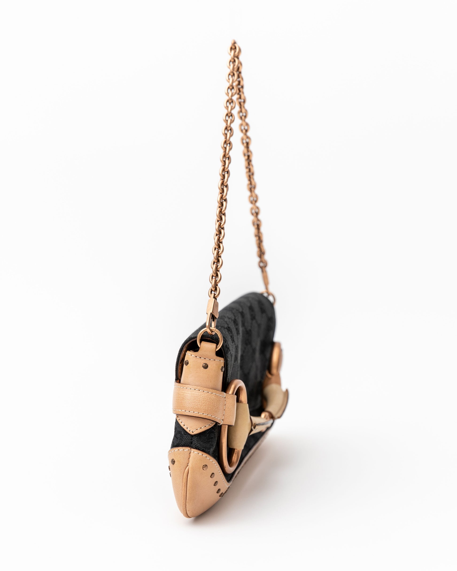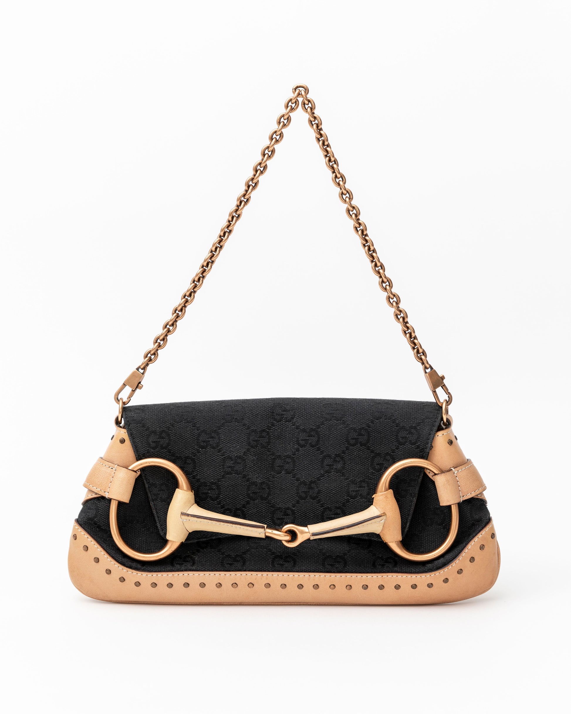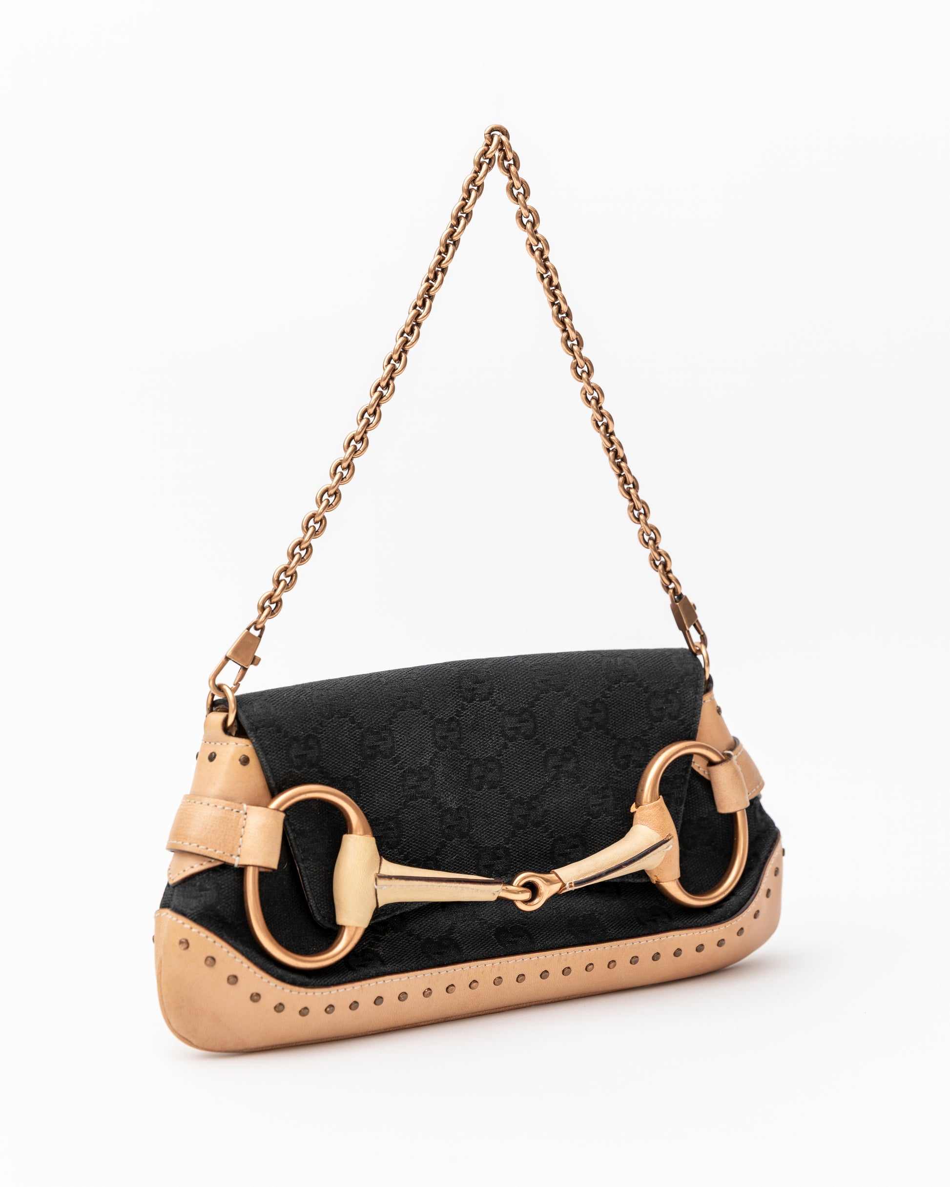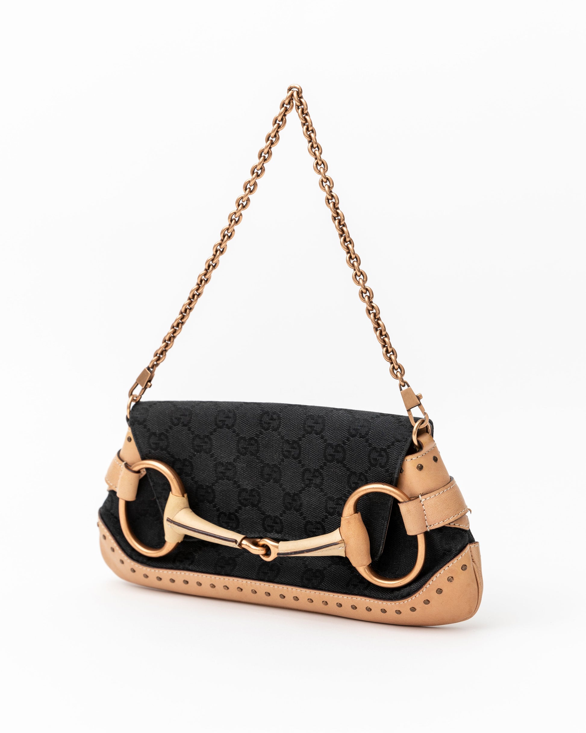 - An edgy Tom Ford era Gucci black and tan pochette featuring the iconic gold horsebit. This stunning bag has recently been seen on the Gucci Fall 2023 runway! Get the original version for over half the cost of the re-edition style. Features tan leather with Gucci monogram print. Removable gold chain shoulder strap. Black fabric interior with pocket is in excellent shape.