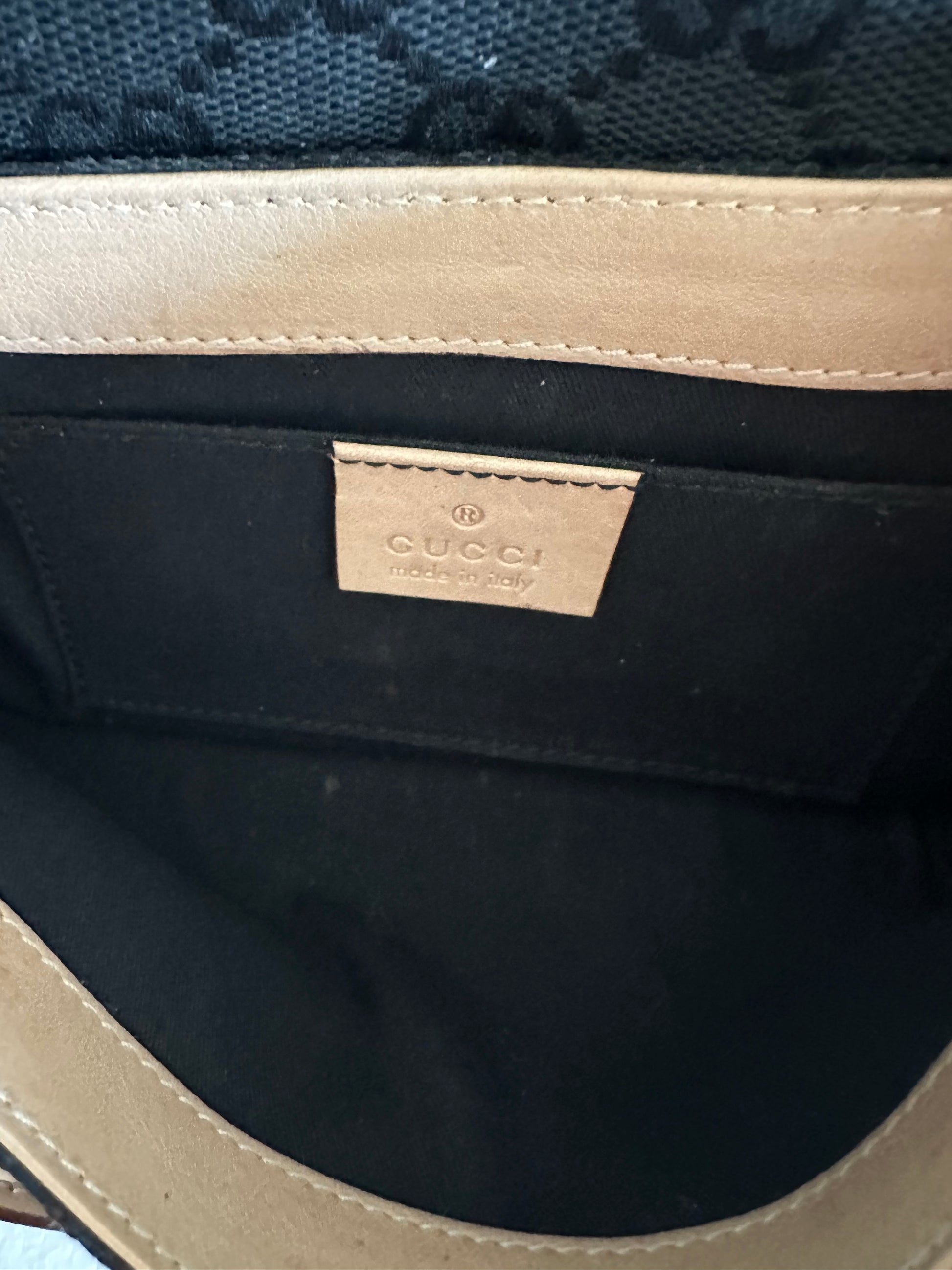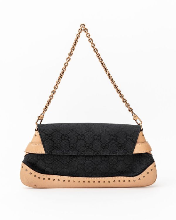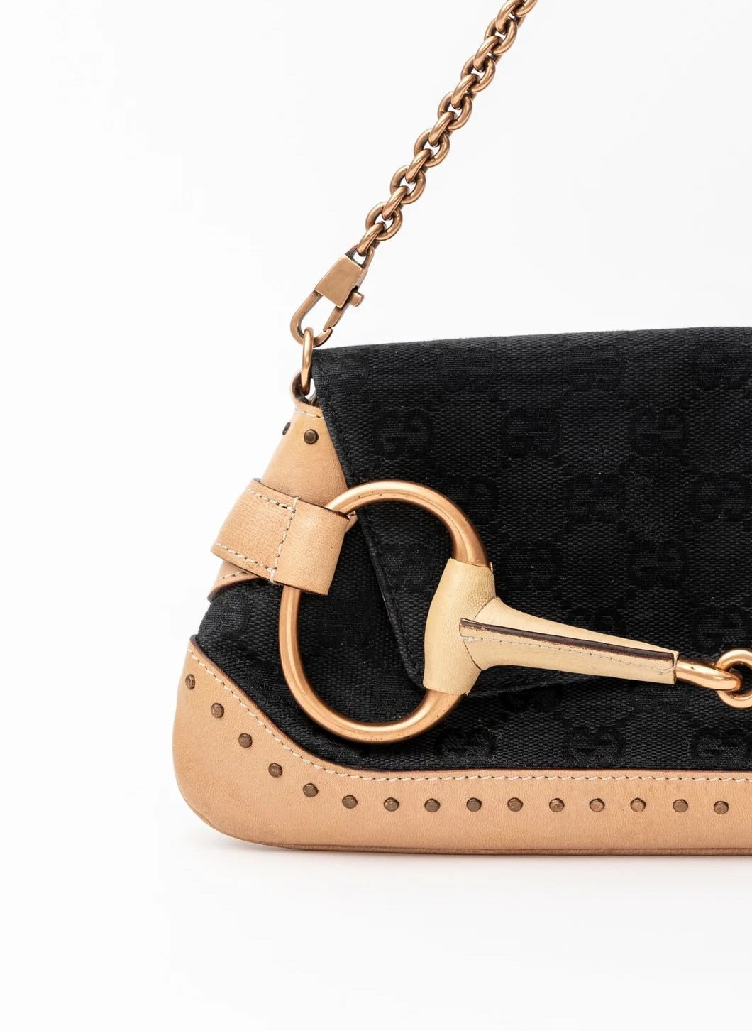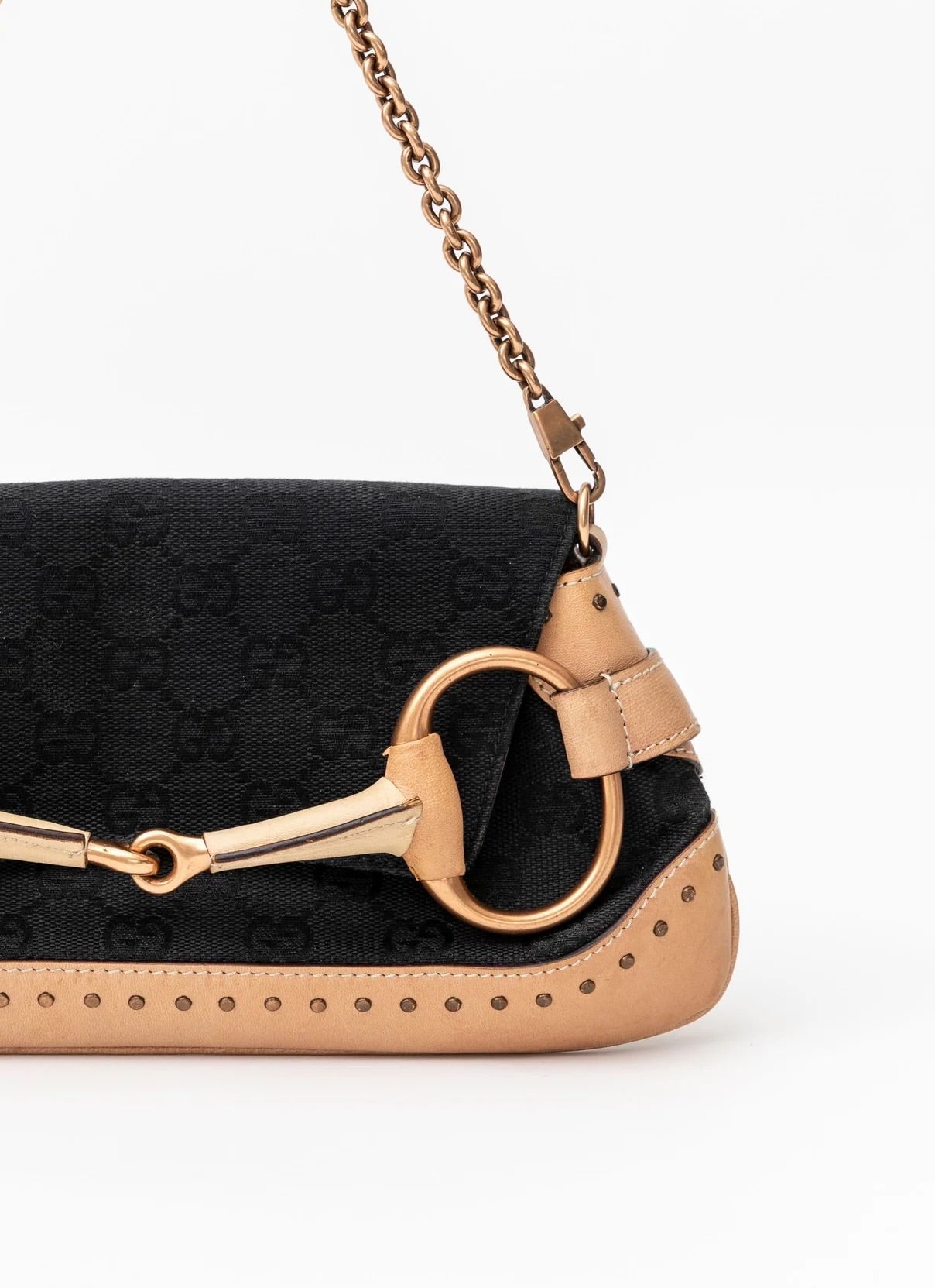 - An edgy Tom Ford era Gucci black and tan pochette featuring the iconic gold horsebit. This stunning bag has recently been seen on the Gucci Fall 2023 runway! Get the original version for over half the cost of the re-edition style. Features tan leather with Gucci monogram print. Removable gold chain shoulder strap. Black fabric interior with pocket is in excellent shape.